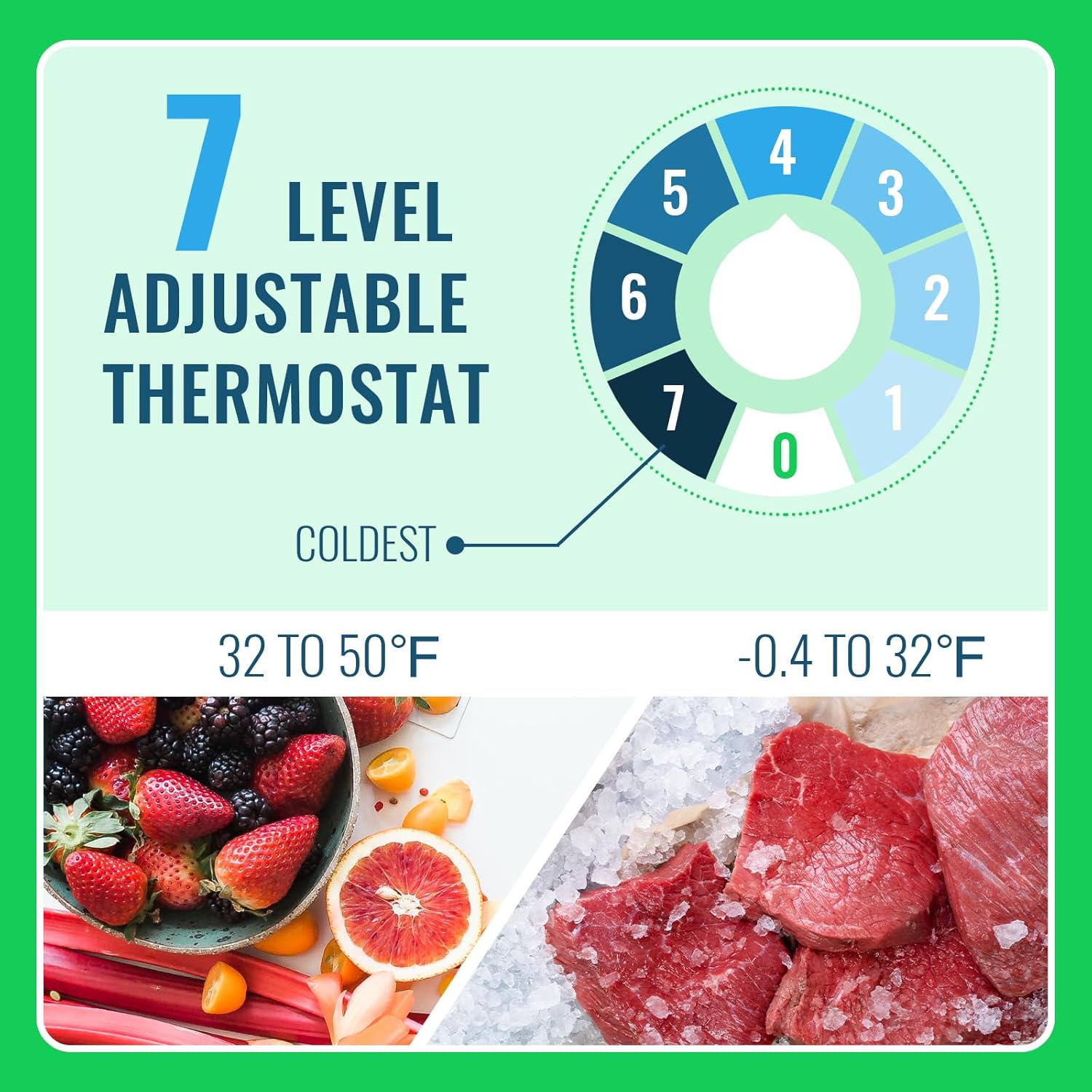 Temperature settings range from 0 (off) to 7 (coldest), with 5 being the ideal temperature. Temp range: -0.4℉ to 50℉.