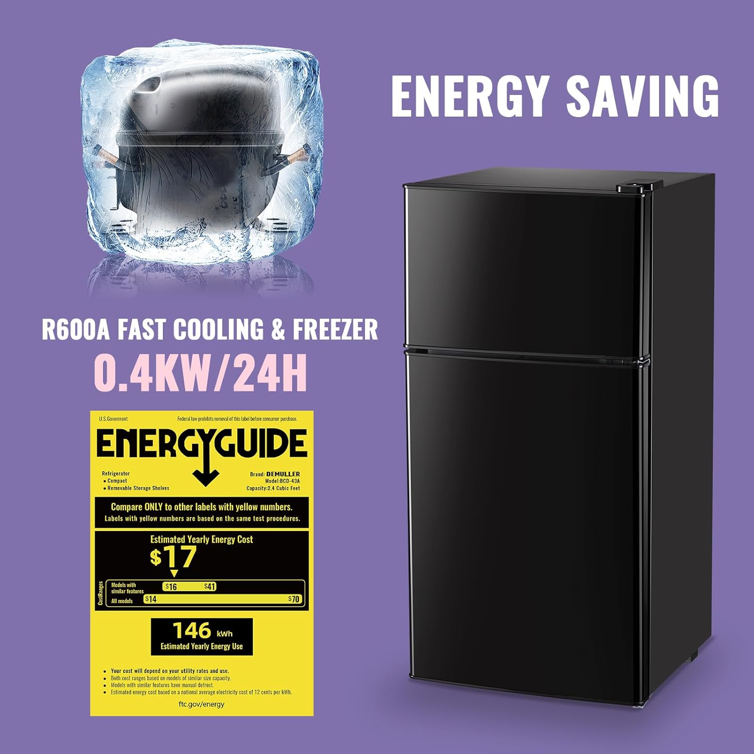 FULL FUNCTIONALITY: The DEMULLER double door refrigerator has both freezer and refrigerator functions. The top freezer has a capacity of 0.6 cu. ft and the freezer has a capacity of 1.8 cu.ft