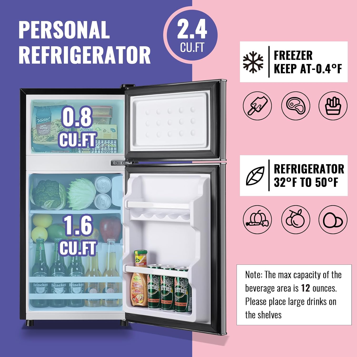 SEPARATE REFRIGERATOR: The personal fridge,which is has two independent storage spaces. The beverage section of the machine is suitable for beverages up to 12 ounces in capacity. Large bottles of beverages are suitable to be placed on removable shelves