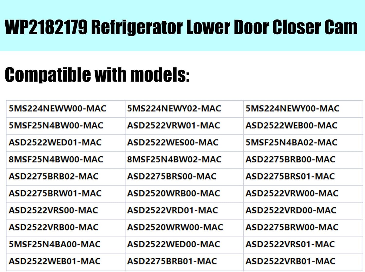 【Whirlpool Refrigerator Door Cam Kit】WP2182179 Refrigerator Lower Door Closer Cam Compatible with models: 5MS224NEWW00-MAC 5MS224NEWY00-MAC 5MS224NEWY02-MAC 5MSF25N4BA00-MAC 5MSF25N4BA02-MAC 5MSF25N4BW00-MAC ASD2522VRW01-MAC ASD2522WEB00-MAC ASD2522WEB01-MAC ASD2522WED00-MAC ASD2522WED01-MAC ASD2522WES00-MAC.