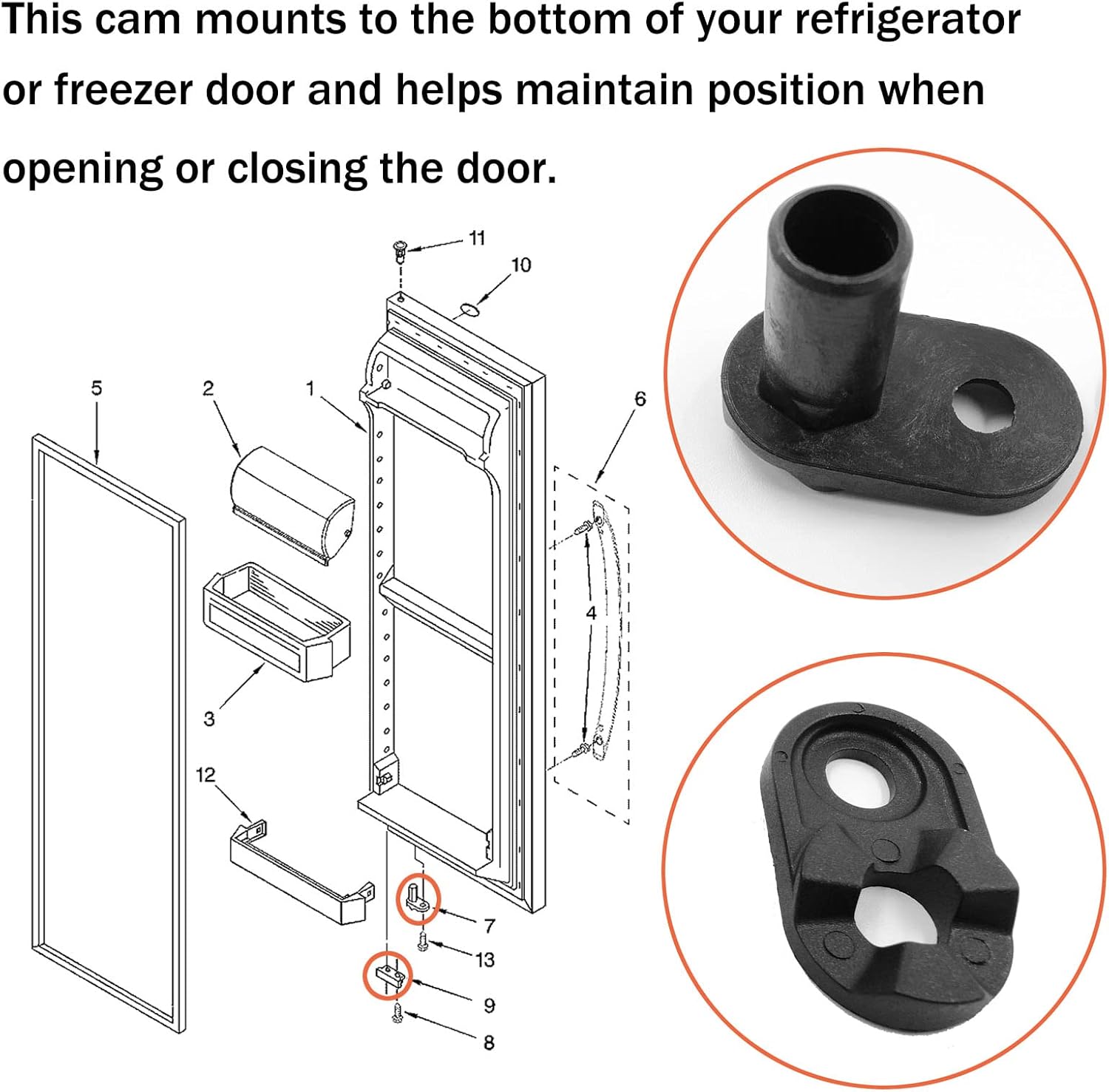 【Solve Problems】This cam mounts to the bottom of your refrigerator or freezer door and helps maintain position when opening or closing the door. IT is advised to lubricate this cam during installation.