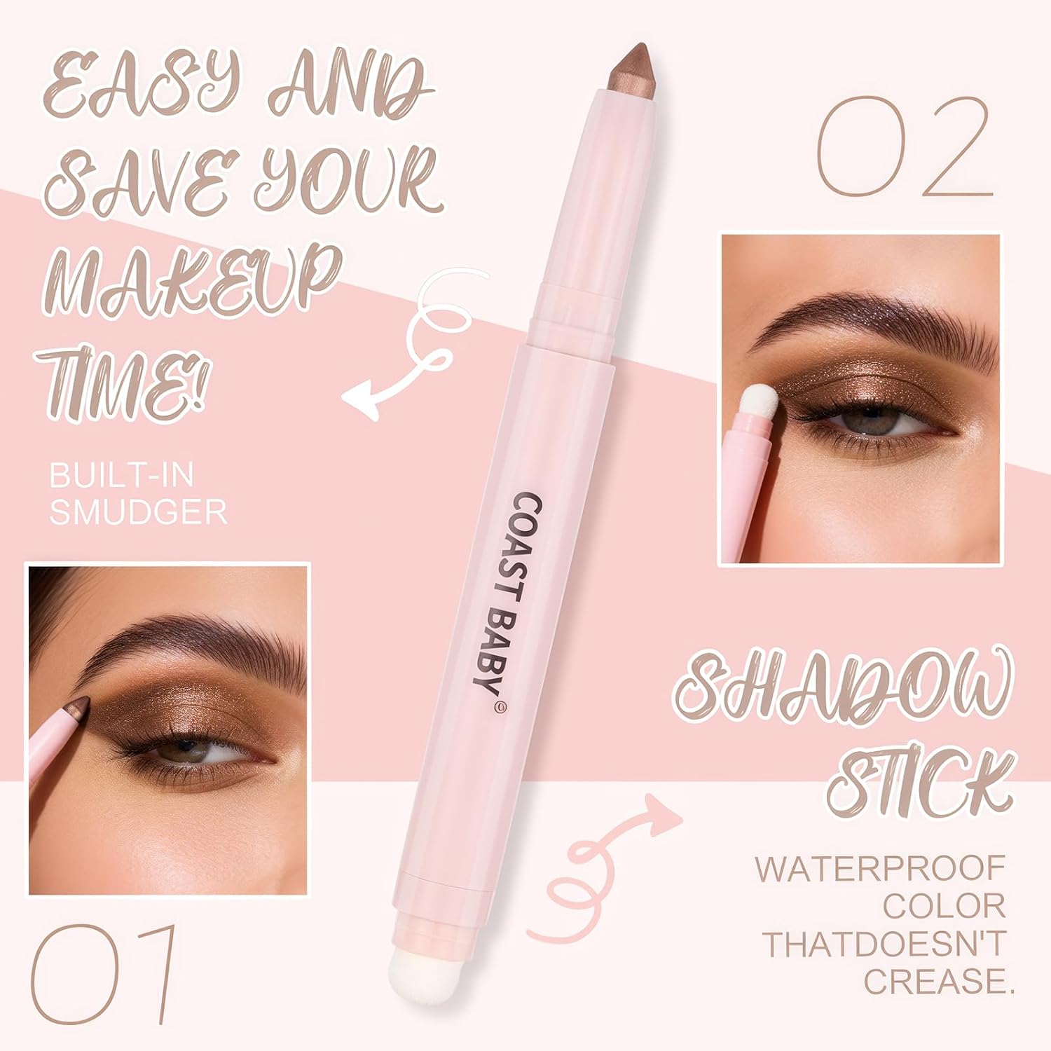 Eyeshadow Stick & Blending Sponge 2 In 1: Our eye shadow stick is double headed design. One end is an accurate eye shadow stick, which can be easily applied. On the other end is a sponge that is easy to achieve a smudging effect. The design of the sponge end is easy to mix. Whether you like the soft makeup for commuting or the eye-catching effect for holiday parties, this shimmer cream eyeshadow can let you quickly blend colors together, so that you can easily have a delicate makeup effect.