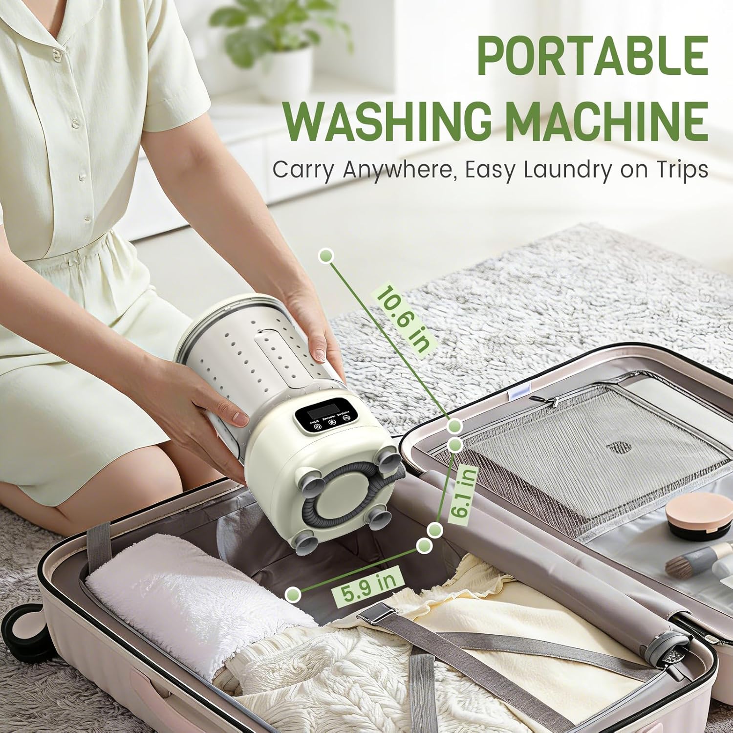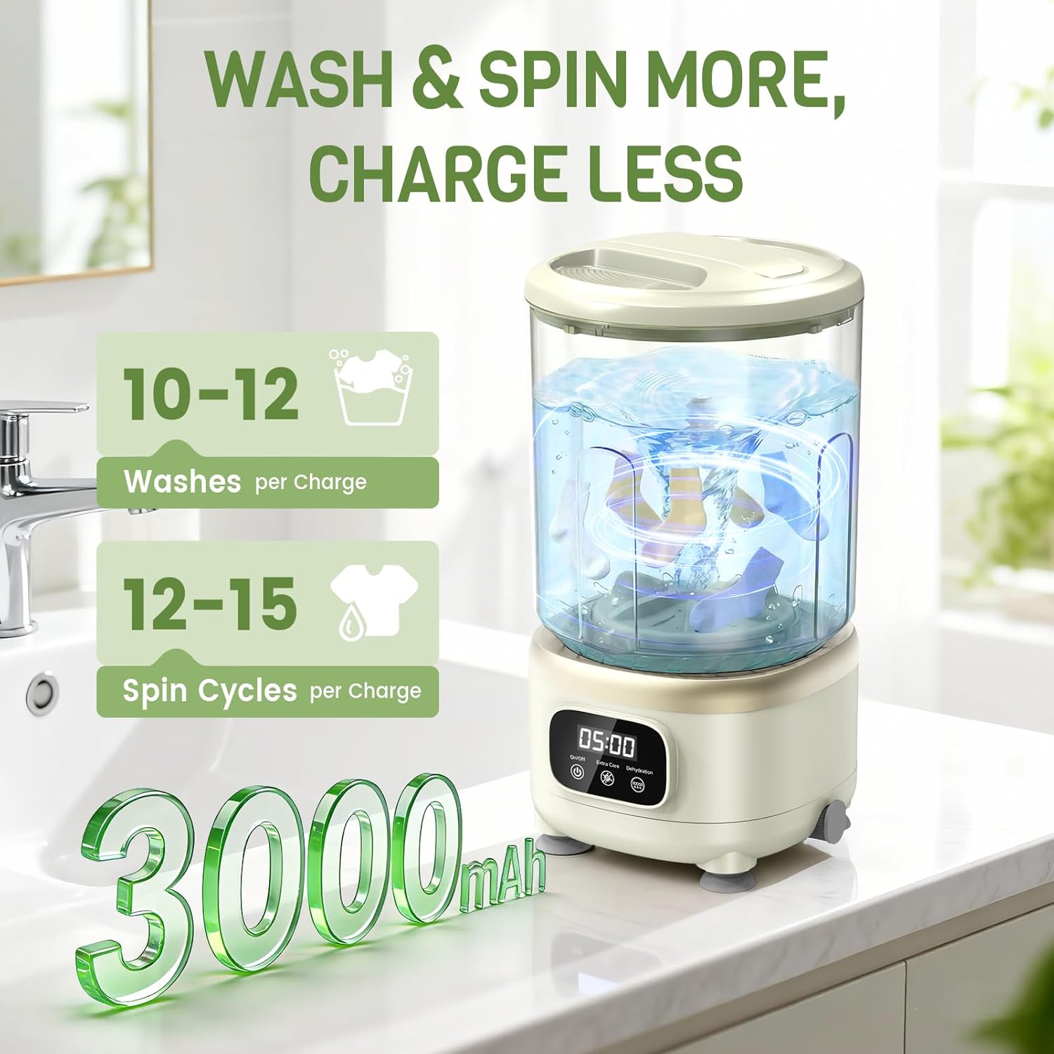 【Cordless & Portable On the Go】:Portable laundry machine built-in 3000mAh battery supports about 10–12 washes or 12–15 spins. No power outlet needed, lightweight and easy to store, ideal for camping, business trips, dorms, apartments, or RVs.
