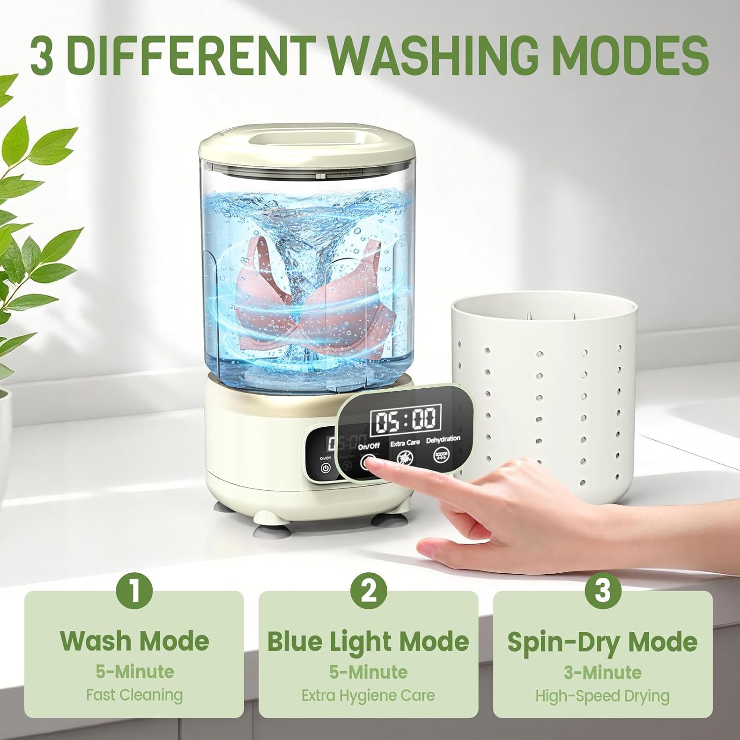 【One-Touch Wash, Rinse & Spin-Truly Hands-Free】:This mini washing machine features three built-in modes: 5-minute wash, 5-minute rinse, and 3-minute spin. With just one press, the entire cleaning process is completed automatically. No hand washing and no wringing needed. The dedicated spin basket efficiently removes excess water, helping clothes dry faster and making them ready for low-temperature drying.