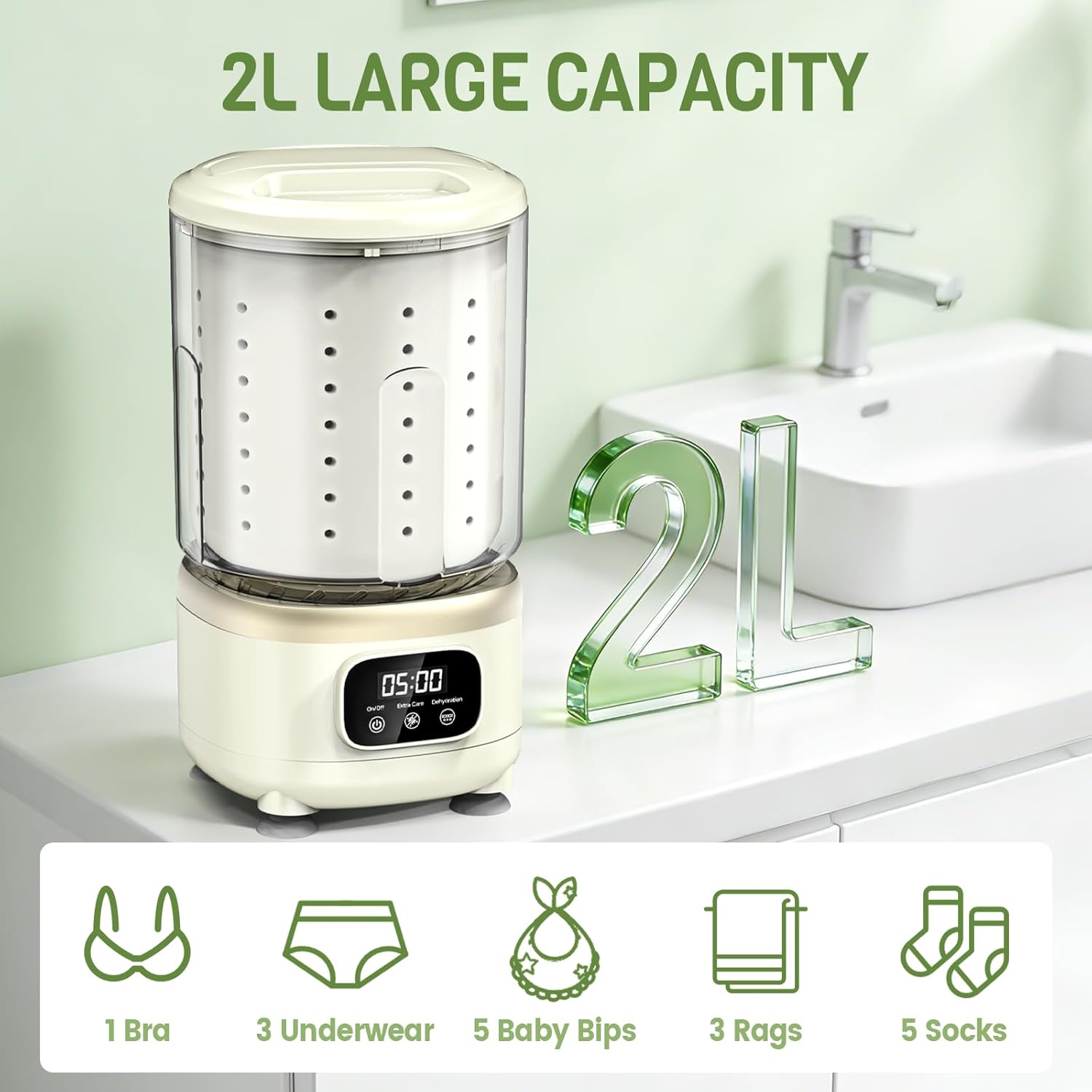 【2L Large Capacity Mini Washer】:Wash about 3 panties, 5 pairs of socks, or 1 bra at a time. Avoid mixing with outerwear, reduce cross-contamination, and keep intimate clothes private and safe. ※Note: not suitable for large items (skirts, pants, sweaters, towels).