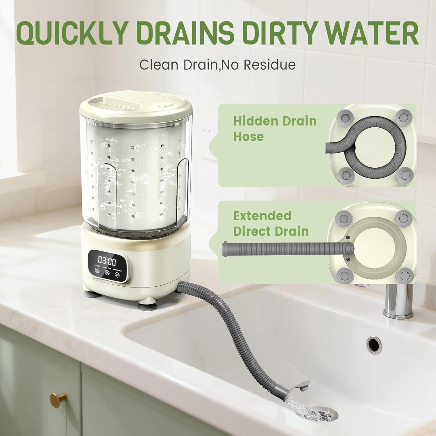 【Hidden Drain & Leak-Proof Design】:underwear washing machine tight leak-proof structure prevents spills. Hidden drain hose makes draining easy, no lifting needed, hands stay clean, and storage remains tidy—small-item washing is hassle-free.※Note: for optimal performance, please do not exceed the maximum water level.