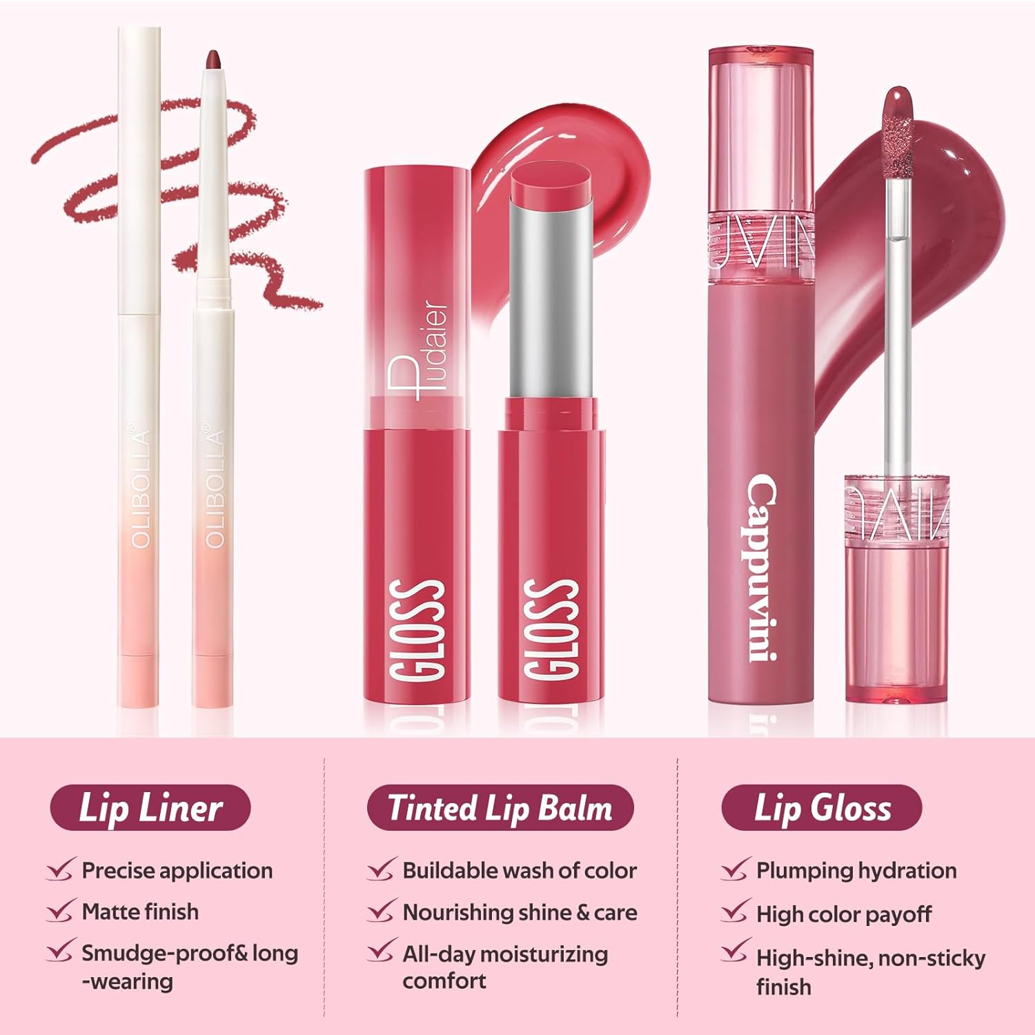 Easy 3-Step Application: Get perfect results in minutes! Step 1 – apply lip liners to define your natural shape. Step 2 – use the long lasting lipstick for colour and hydration. Step 3 – add the lip tint for a glossy finish. This simple 3-step routine creates stunning lips every time