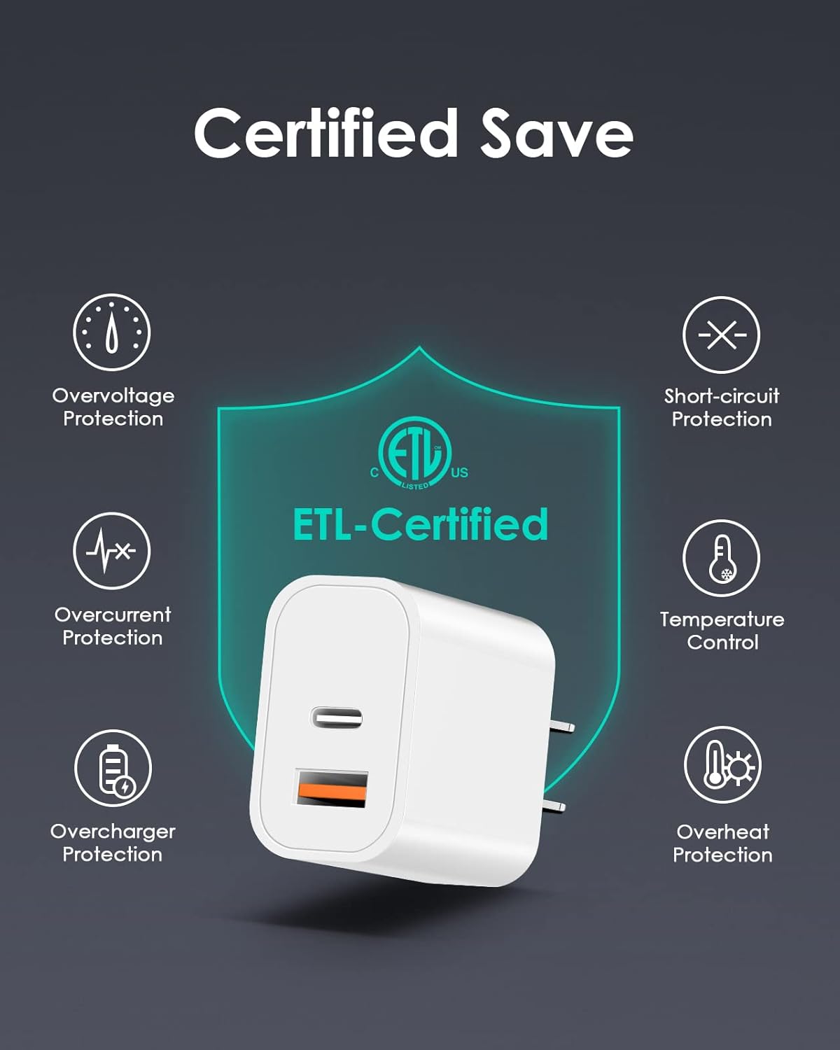 [Superior Safety] Conforms to the ETL safety standard, this usb c wall charger is equipped with a wide range of safety features including temperature control, overvoltage and overcurrent protection, so you can rest easy while charging your devices.