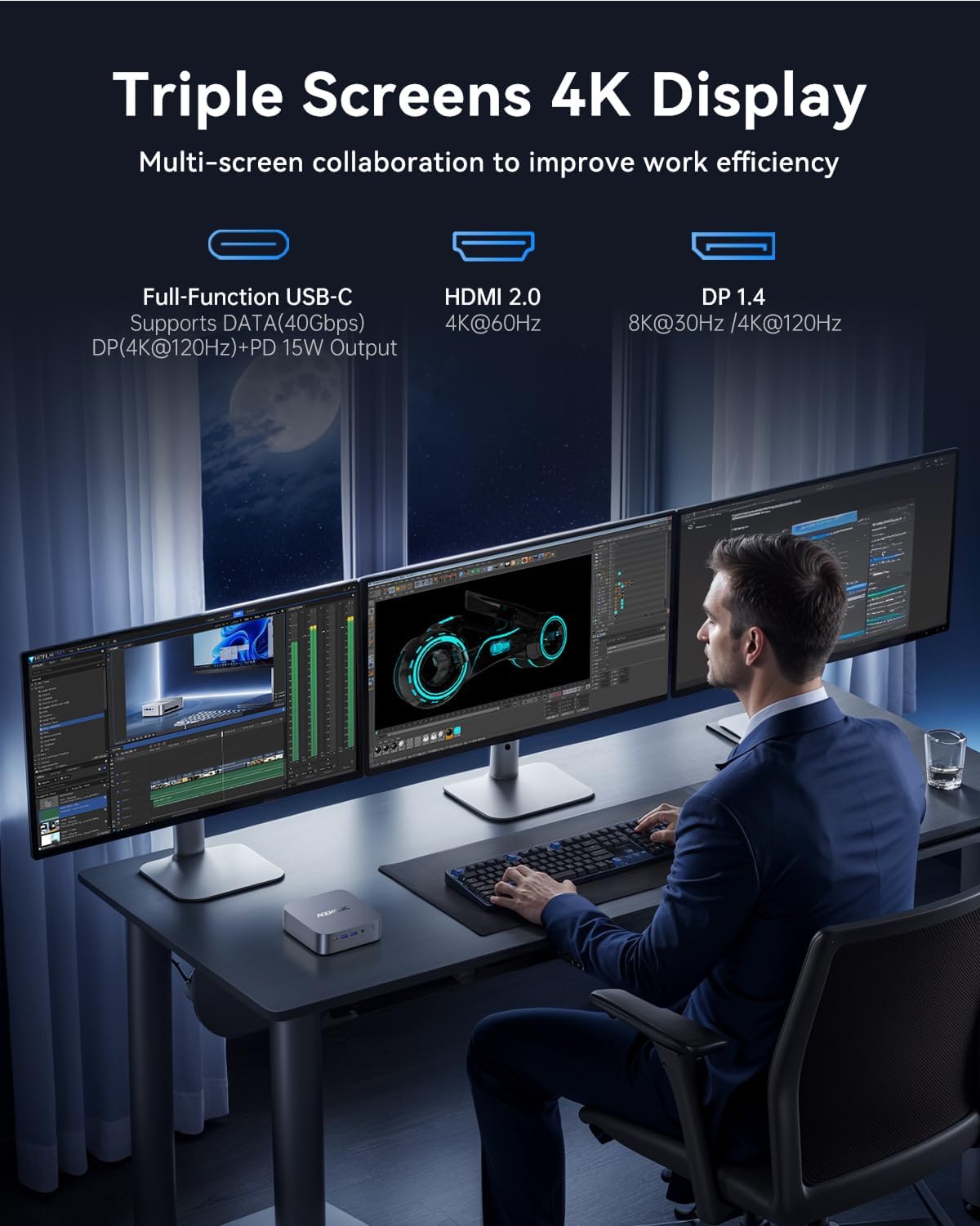 [ULTRA-FAST CONNECTIVITY USB4 &WIFI 6E, 2.5G LAN, TRIPLE DISPLAY] Equipped with WiFi 6E, Bluetooth 5.2, and a 2.5GbE LAN port—delivering lag – free online meetings and stable high – speed networking for this mini pc. Its USB4 port takes performance further: boasting up to 40Gbps transfer speeds, it moves a 3GB 4K video in just 1 second and unlocks seamless connections with Thunderbolt 3/4 devices, high – speed NVMe SSDs, or even eGPUs for boosted performance. It also supports DisplayPort Alt – Mode, letting you drive a 4K 60Hz monitor directly—paired with other video ports, this enables triple display output for expanded multitasking on the mini pc windows 11.