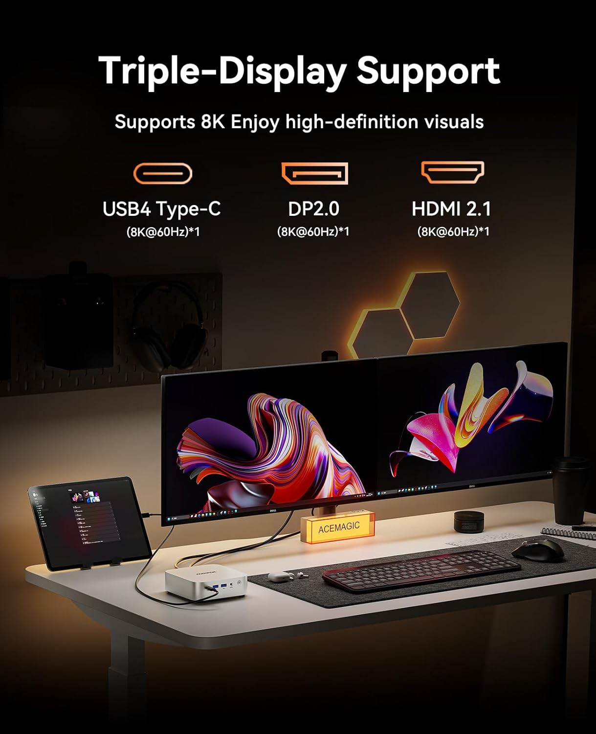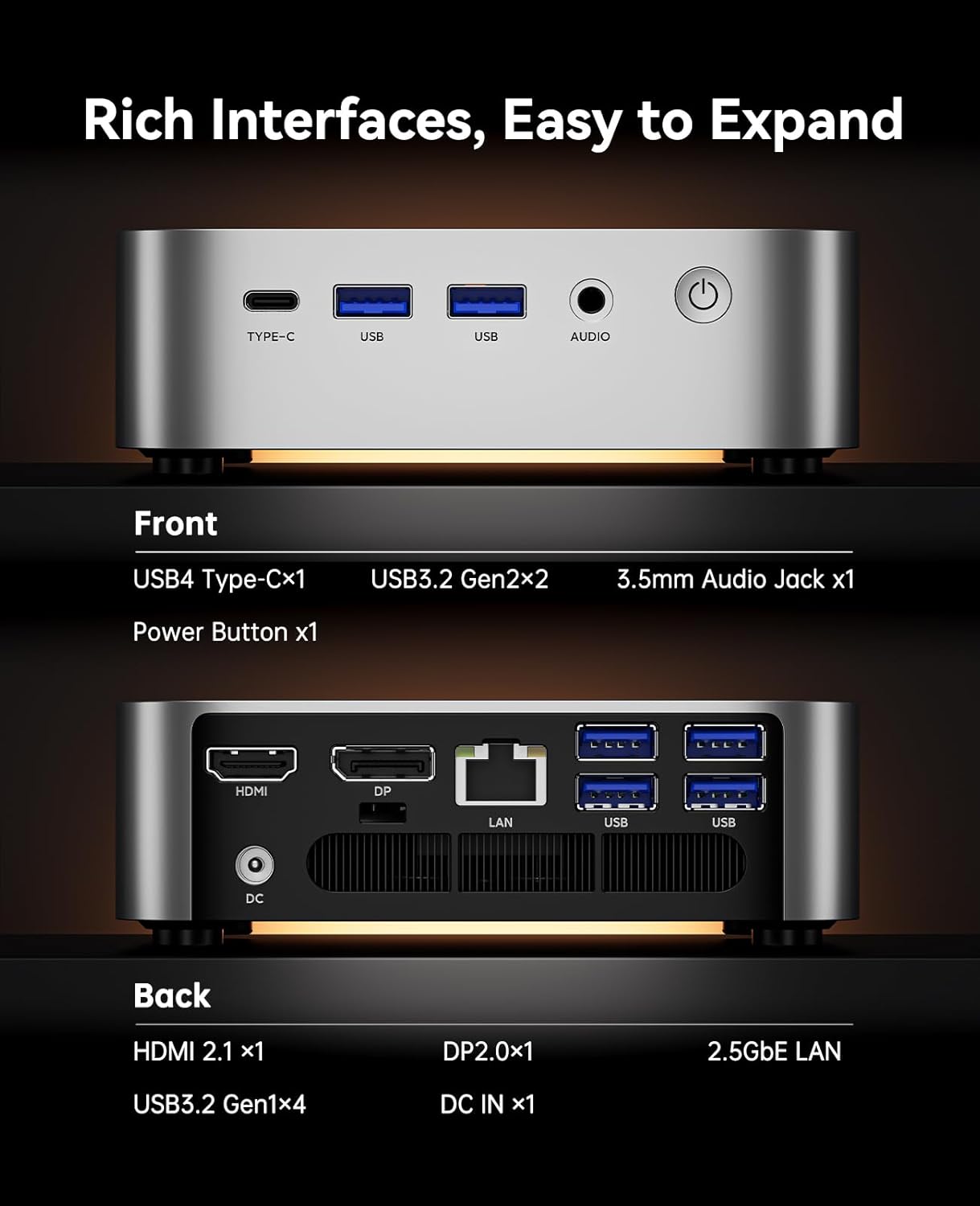 【Versatile 6xUSB3.2 Ports, 1xUSB4 Type-C & High-Speed Network】Featuring 6×USB3.2 and a USB4 Type-C port with up to 10Gbps transfer speed, this mini PC lets you move large files in seconds for higher productivity. The Type-C port also supports DP1.4 (8K@60Hz) display output and PD charging. With a 2.5G RJ45 port delivering blazing-fast 2500Mbps wired speeds, plus WiFi 6E and Bluetooth 5.2 for strong, stable, and seamless wireless connections, you’ll enjoy smooth work and entertainment without lag.