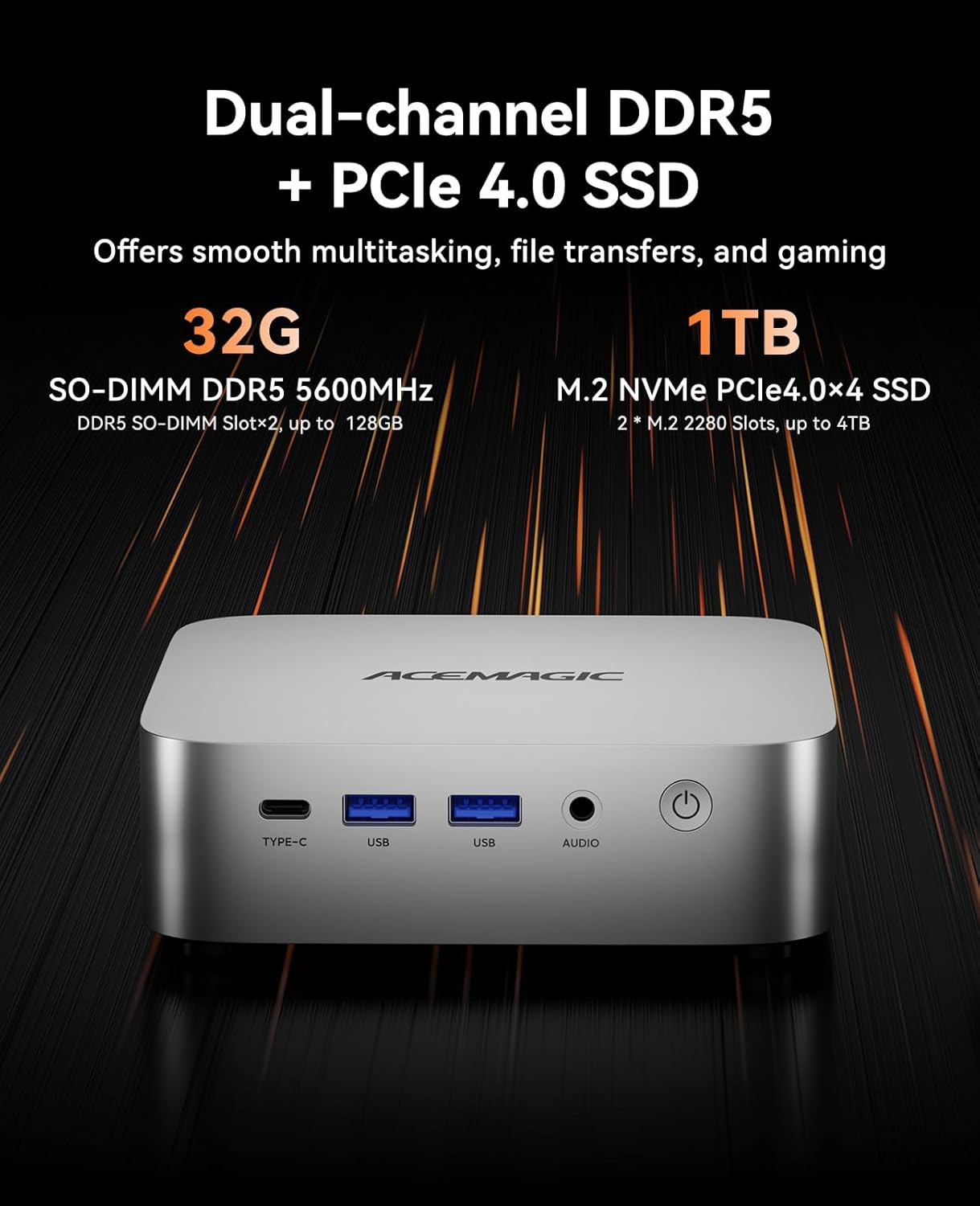 【Large Capacity & Flexible Expansion】This mini computer comes with 32GB DDR5 5600MHz (dual-channel expandable up to 128GB) and a fast 1TB PCIe 4.0 M.2 SSD, enabling smooth multitasking and high-performance operations. For even greater storage, you can easily add a 2.5″ SSD (not included) to expand up to 4TB, giving you the flexibility to meet your growing work and entertainment needs.