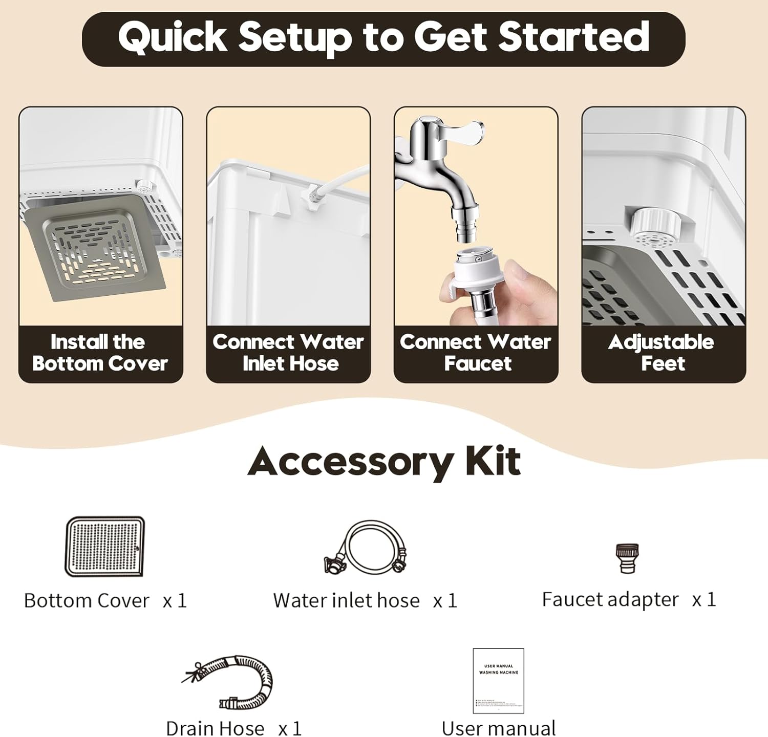 [Compact & Space-Saving Design] With dimensions of just 20″ x 20″ x 33.7″, this portable washer is designed to fit perfectly in spaces like apartments, dorms, and RVs. It also comes with a faucet adapter for easy installation, ensuring that it meets the water inlet requirements.