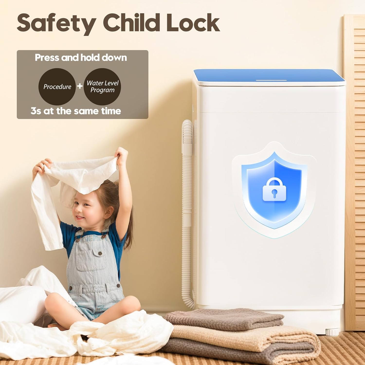 [User-Friendly & Child Safety Lock] This compact washing machine is easy to operate with a simple “On/ Off” and “Start/ Pause” button. The safety lock instantly blocks control panel access during cycles, eliminating accidental setting changes with simple button (Procedure + Water Level) hold (3 sec).