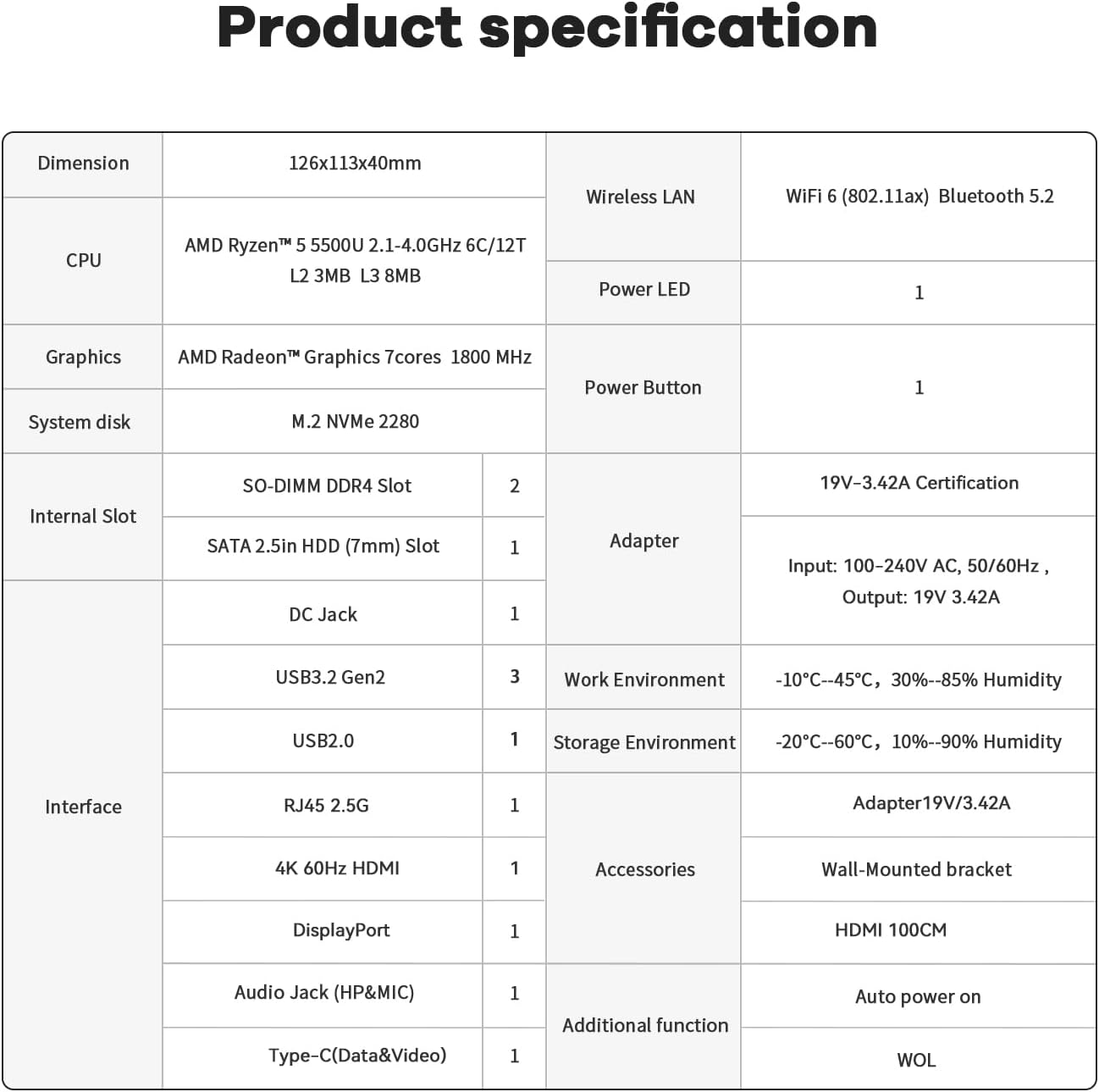 【WiFi 6 and multiple ports, stable and efficient】The 5500U mini computer is equipped with WiFi 6 (802.11ax) and Bluetooth 5.2, supporting faster and more stable data transmission and avoiding network congestion. Multiple ports provide more choices, including 1*HDMI 2.0 (4K@60Hz) port, 1*DP1.4 (4K@144Hz) port, 3*USB3.2 Gen2 port, 1*USB2.0 port, 1*Type-C (4K@120Hz) port, 1*DC interface. 1 RJ45 2.5G interface, and 1 3.5mm audio interface (HP&MIC)