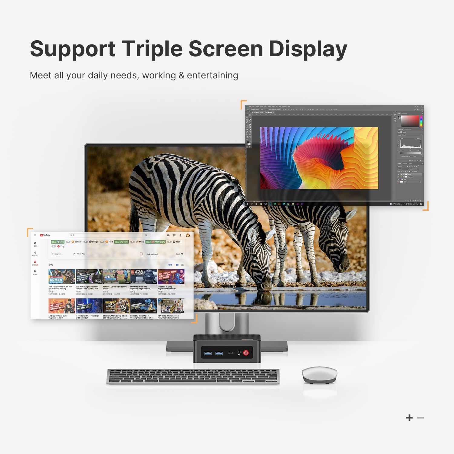【4K Triple Display & USB-C & USB3.2】The mini desktop computer Drives three 4K monitors via HDMI, DisplayPort and USB-C for multi-window productivity or immersive home theater setups;USB 3.2 meets your multi-interface transfer needs.