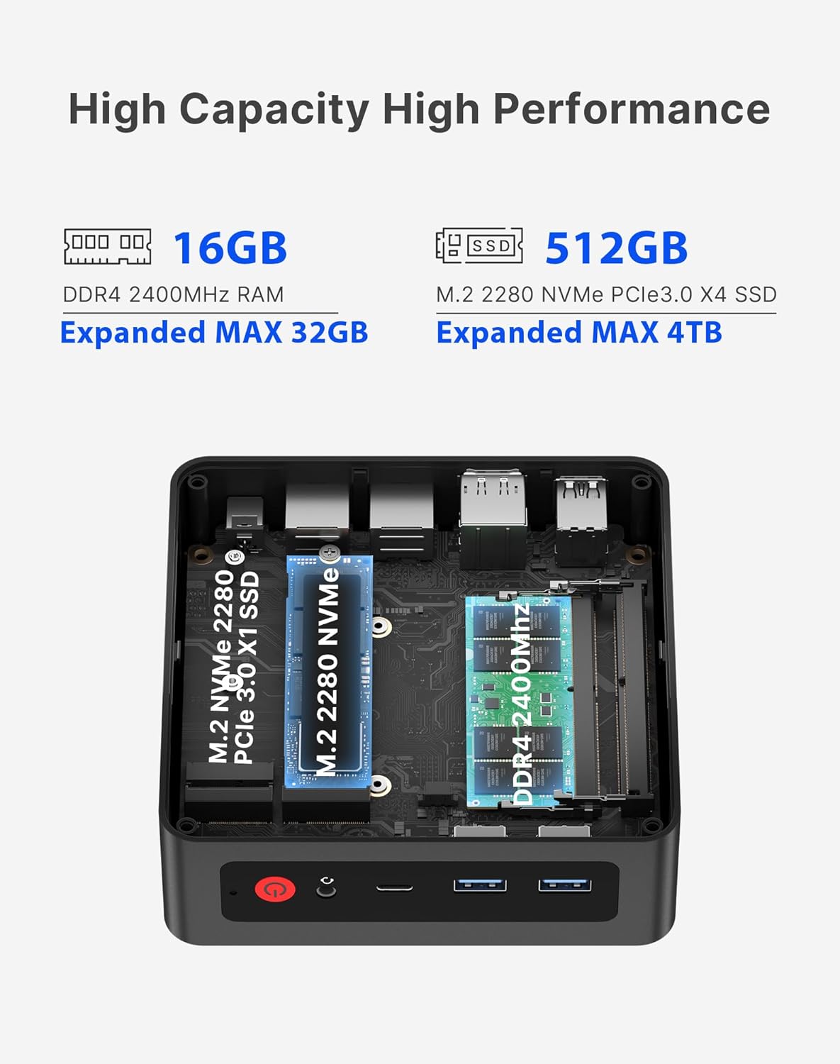 【Expandable Memory and Storage】The 3550H mini pc ships with 16GB DDR4 RAM (expandable up to 32GB) and a 512GB M.2 2280 SSD, letting you run multiple high-performance tasks simultaneously. Fast data read/write speeds and storage capabilities ensure smooth application performance. If you need more storage space, you can easily replace the M.2 2280 NVMe PCIe 3.0 X1 SSD and upgrade it to a maximum of 4TB.