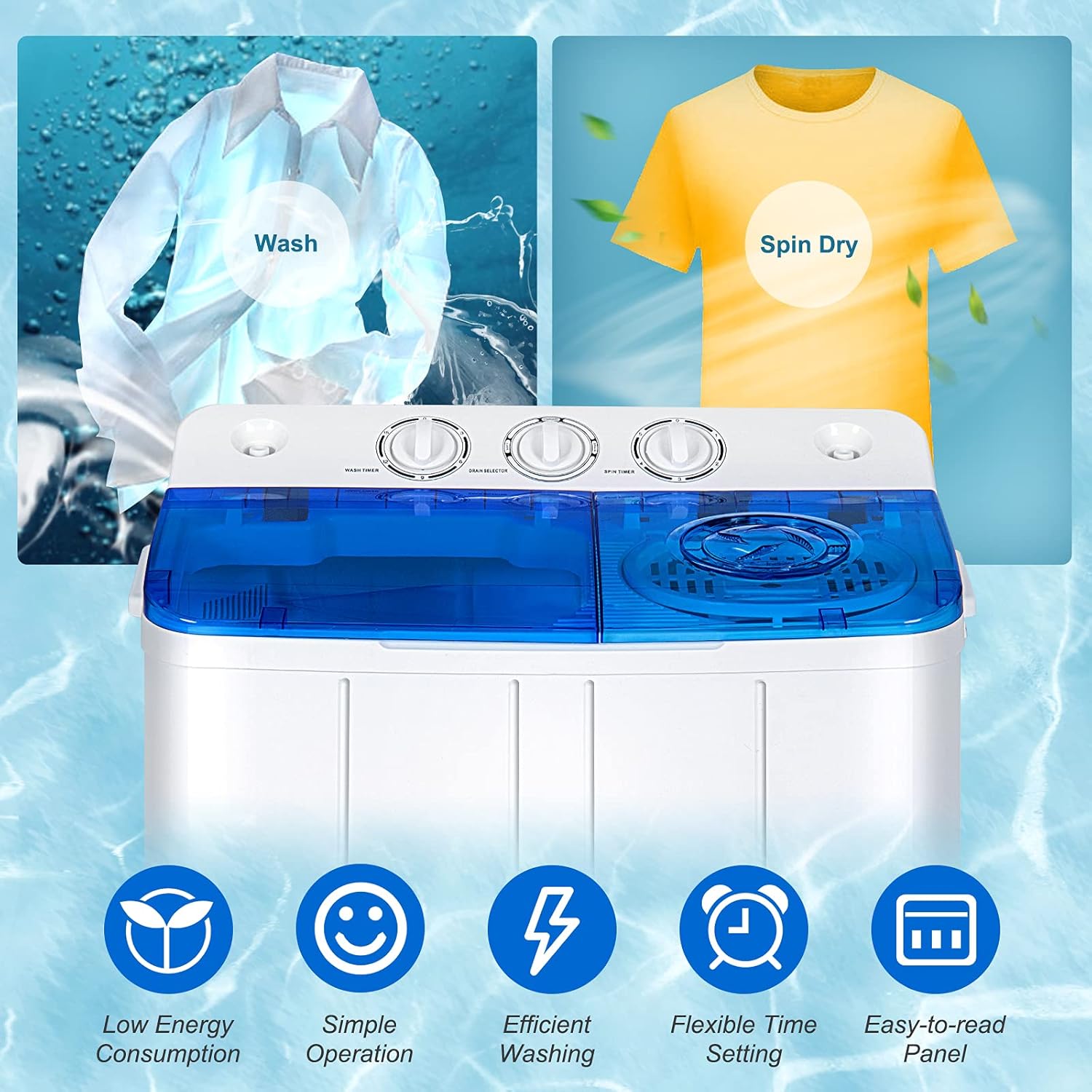 [Powerful & Low Noise Motor:]High-performance motor ensures smooth running, continuous output and high safety for lasting service life. It can help you save energy and complete laundry tasks effectively. Also, it will not make annoying noises and disturb neighbors during operation. You can view the washing/spinning process at any time through the transparent cover.