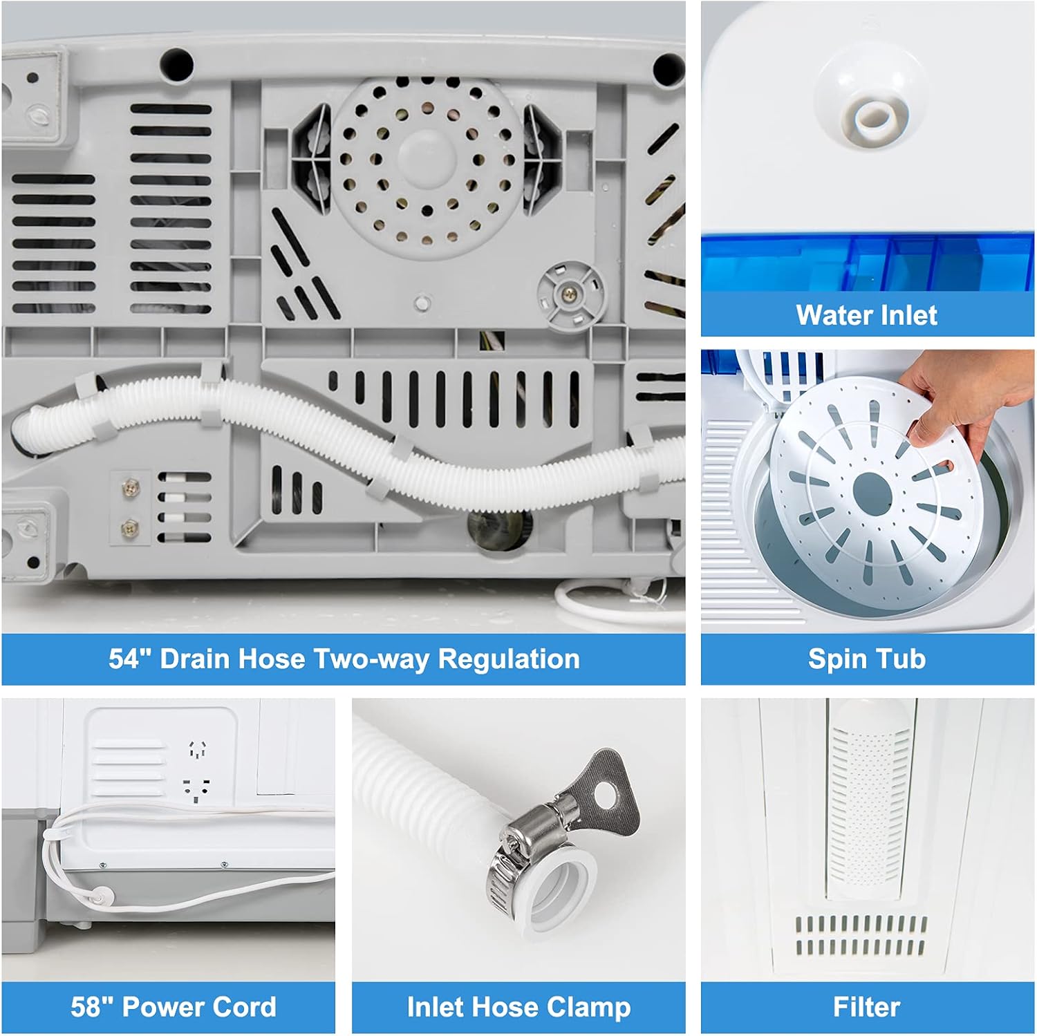 [Easy to Drain & Use:]The excellent drain pump and 54” drain hose bring a lot of convenience in draining excess dirty water. And the filter device prevents the drain outlet from being blocked by unnecessary debris. Just drop clothes in, add laundry detergent, fill with water, set the timer, and you can start washing your clothes.