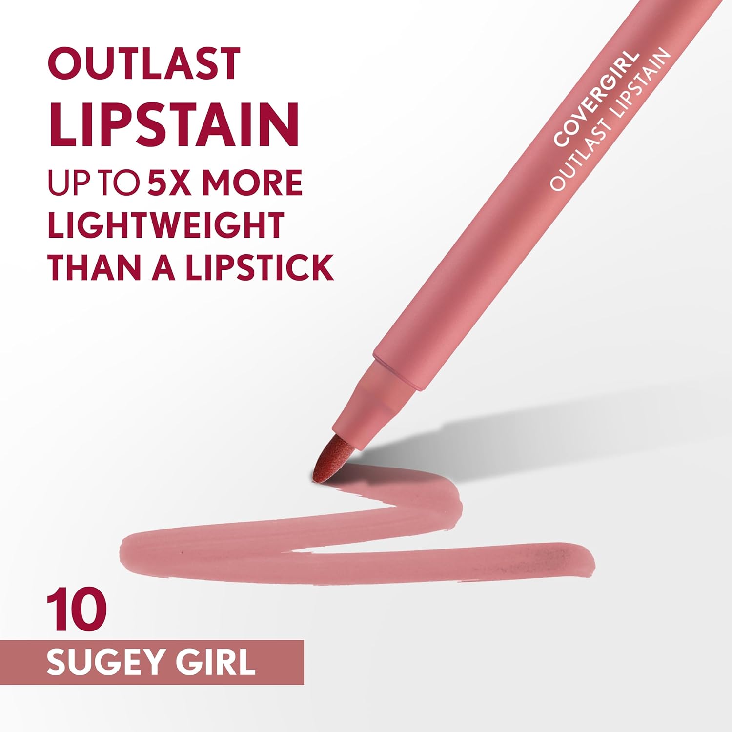 COVERGIRL Outlast, 10 Sugey Girl, Lipstain, Smooth Application, Precise Pen-Like Tip, Transfer-Proof, Satin Stained Finish, Vegan Formula, 0.06oz