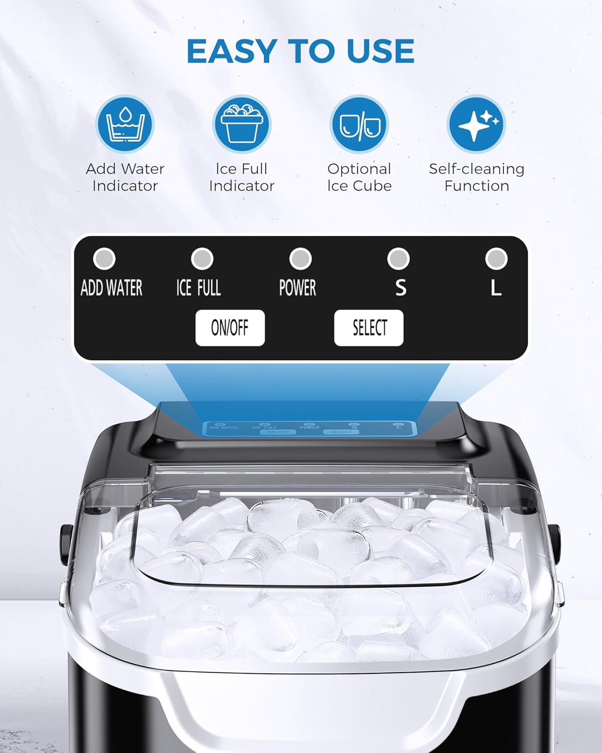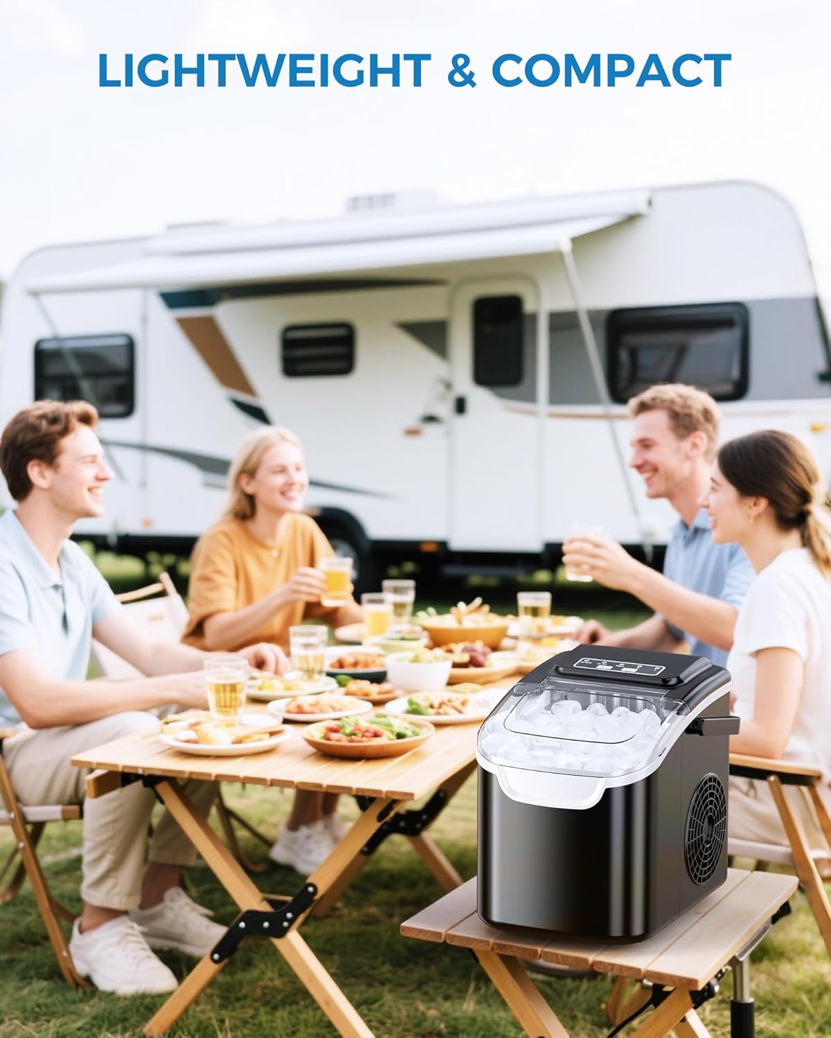 Portable and Space-Saving : This compact ice maker machine features a space-saving design and is easy to carry. You can place this counter ice machine anywhere, making it perfect for kitchens, homes, camping, RVs, parties, dorm rooms, and more.