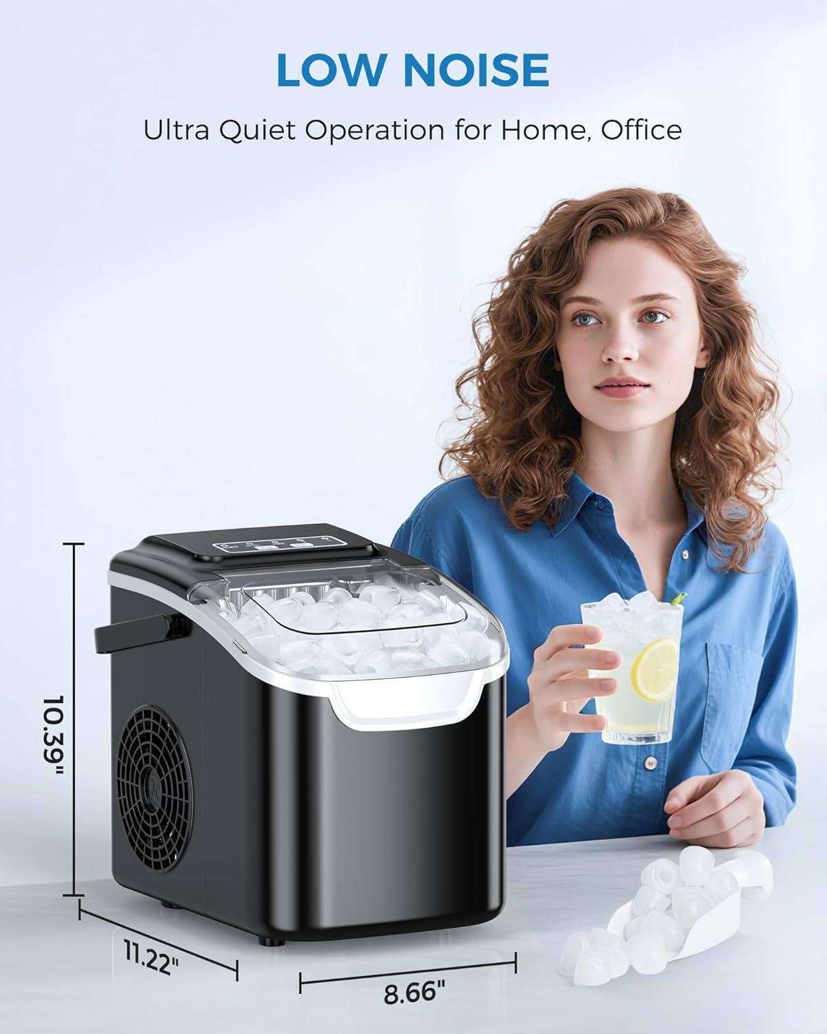 Low-Noise Design : The countertop icemaker employs quiet technology operating below 40 decibels, ensuring a comfortable and peaceful environment while enjoying the ice-making process. Fresh ice cubes are available anytime, maintaining a serene and tranquil space throughout.