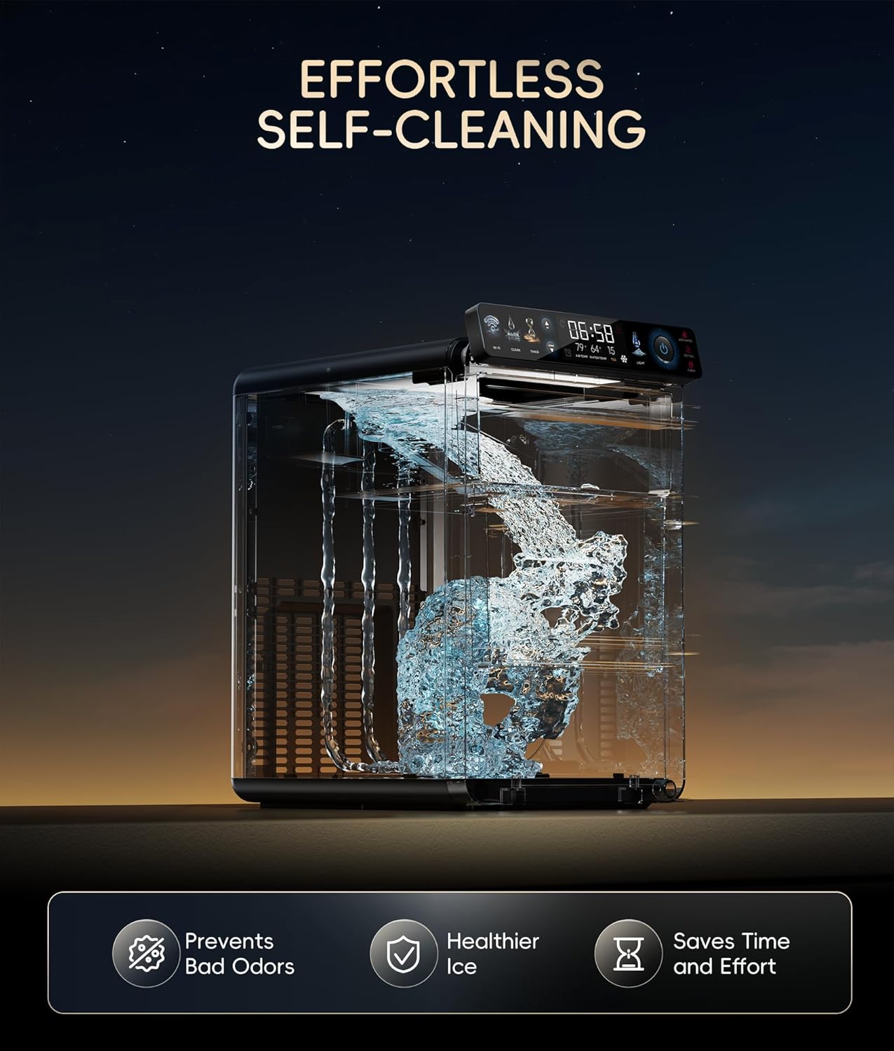 𝐕𝐨𝐢𝐜𝐞 & 𝐀𝐩𝐩-𝐂𝐨𝐧𝐭𝐫𝐨𝐥𝐥𝐞𝐝 𝐈𝐜𝐞: Start, stop, or schedule ice production through the EcozyHome app. Prefer hands-free? Alexa and Google Assistant have you covered