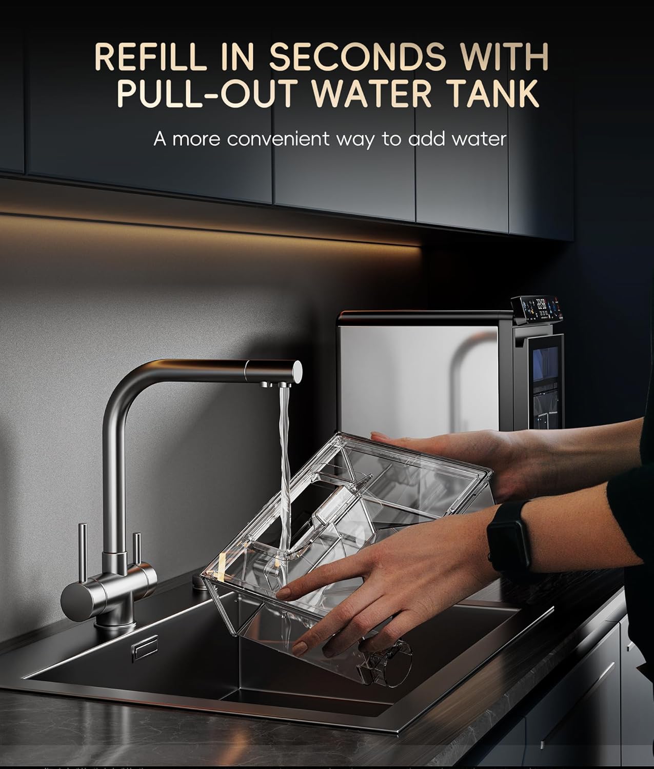 𝐒𝐢𝐦𝐩𝐥𝐢𝐟𝐲 𝐖𝐚𝐭𝐞𝐫 𝐑𝐞𝐟𝐢𝐥𝐥𝐬 & 𝐈𝐜𝐞 𝐀𝐜𝐜𝐞𝐬𝐬: Enjoy effortless refilling and cleaning with the pull-out water tank. The removable basket makes transferring ice simple and tidy