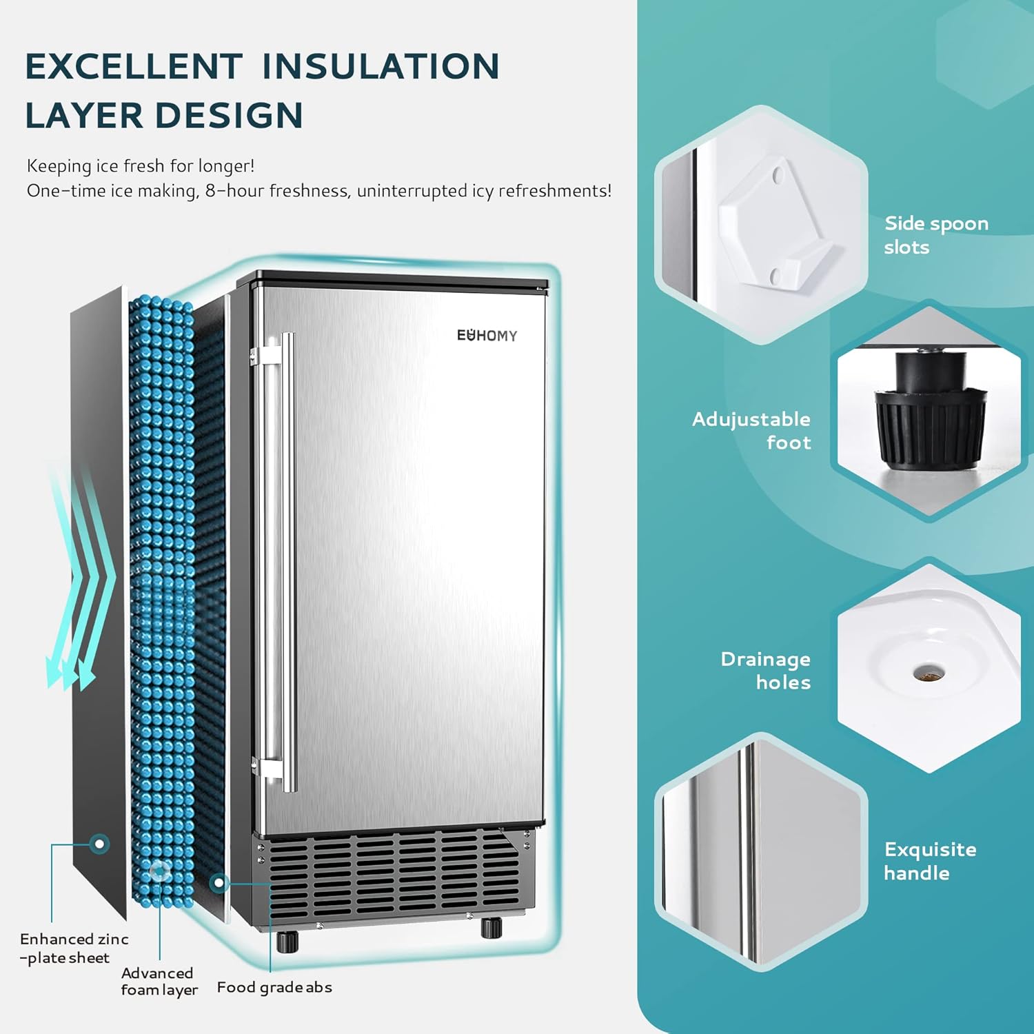 Reversible Door & Cold Insulation: The stainless steel ice maker machine door with a handle can be installed with left or right hinges, allowing you to choose the opening direction according to your needs. The 3-layer housing material ensures longer-lasting ice cubes, preventing them from melting quickly.