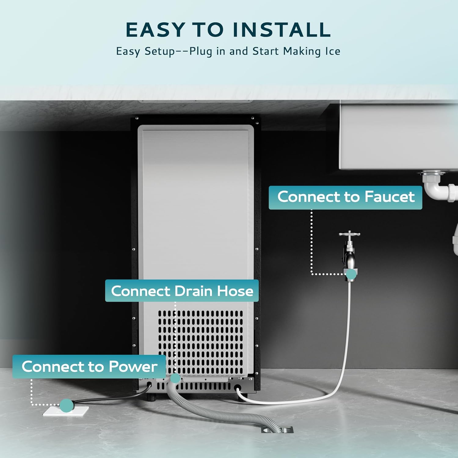 Advanced & Fast Ice Making: Our commercial under counter ice maker machine can produce 90 lbs of ice in 24 hours, providing 40 clear ice cubes every 10-18 minutes for you and your family. The 24 lb storage container ensures a constant supply of ice, meeting all your daily ice needs for your home, restaurant, bar, or hotel.