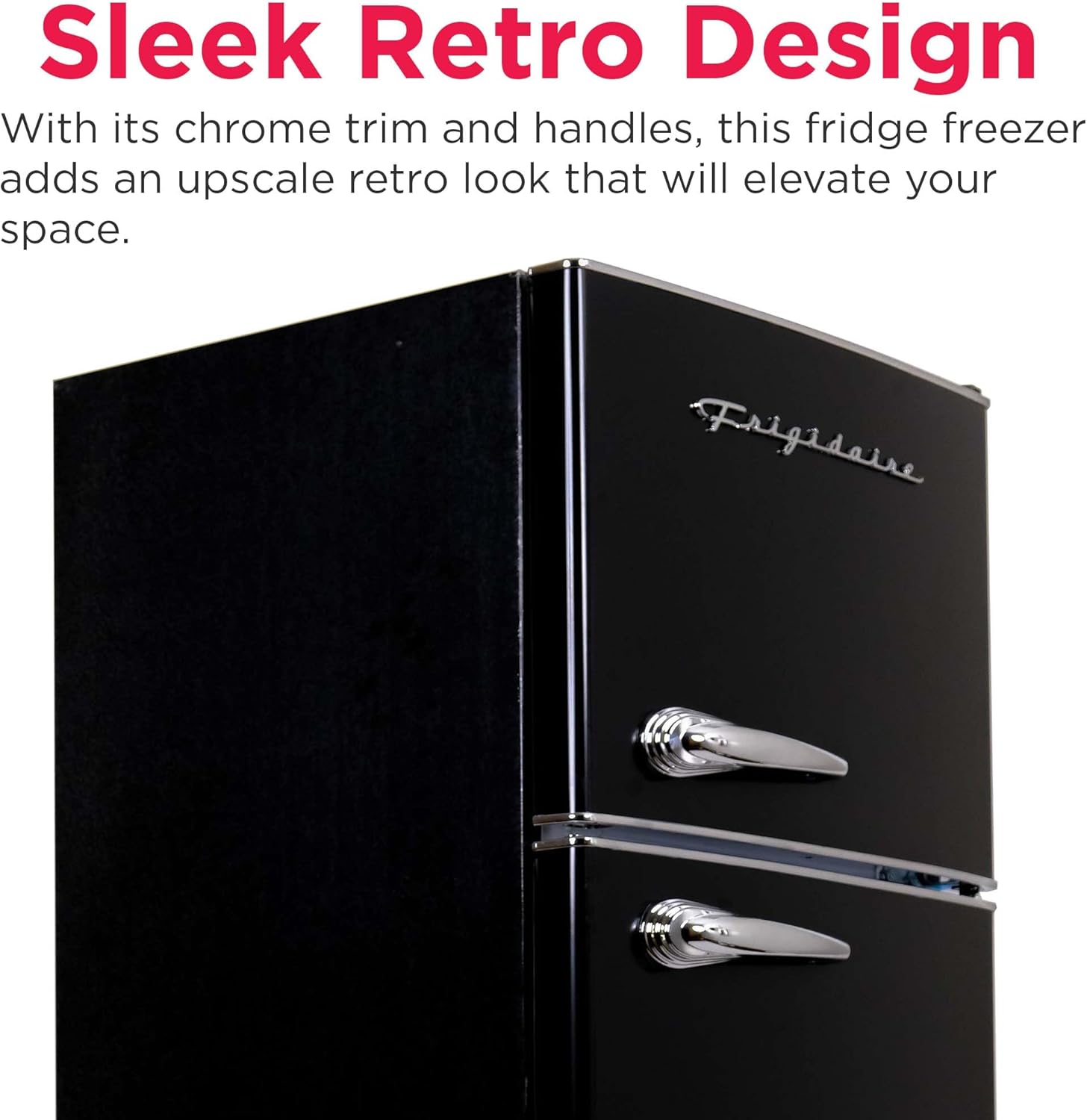 SLEEK RETRO DESIGN: Featuring a sleek and durable retro design with chrome trim and handles, this small fridge freezer adds an upscale retro look that will elevate your space. C