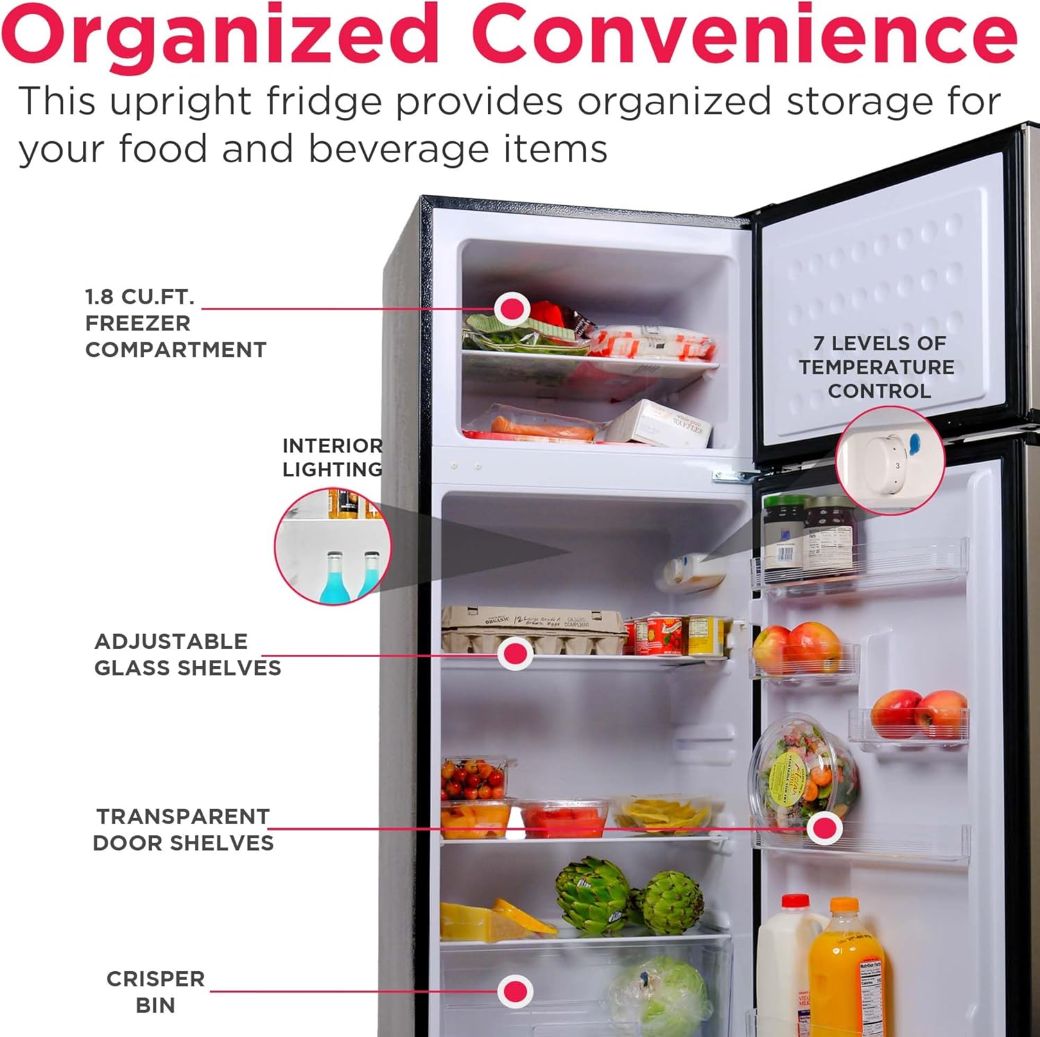ORGANIZED CONVENIENCE: Equipped with removable glass shelves, a transparent crisper, and a full-width door bin, this small upright fridge offers organized and convenient storage for all your food and beverage items.