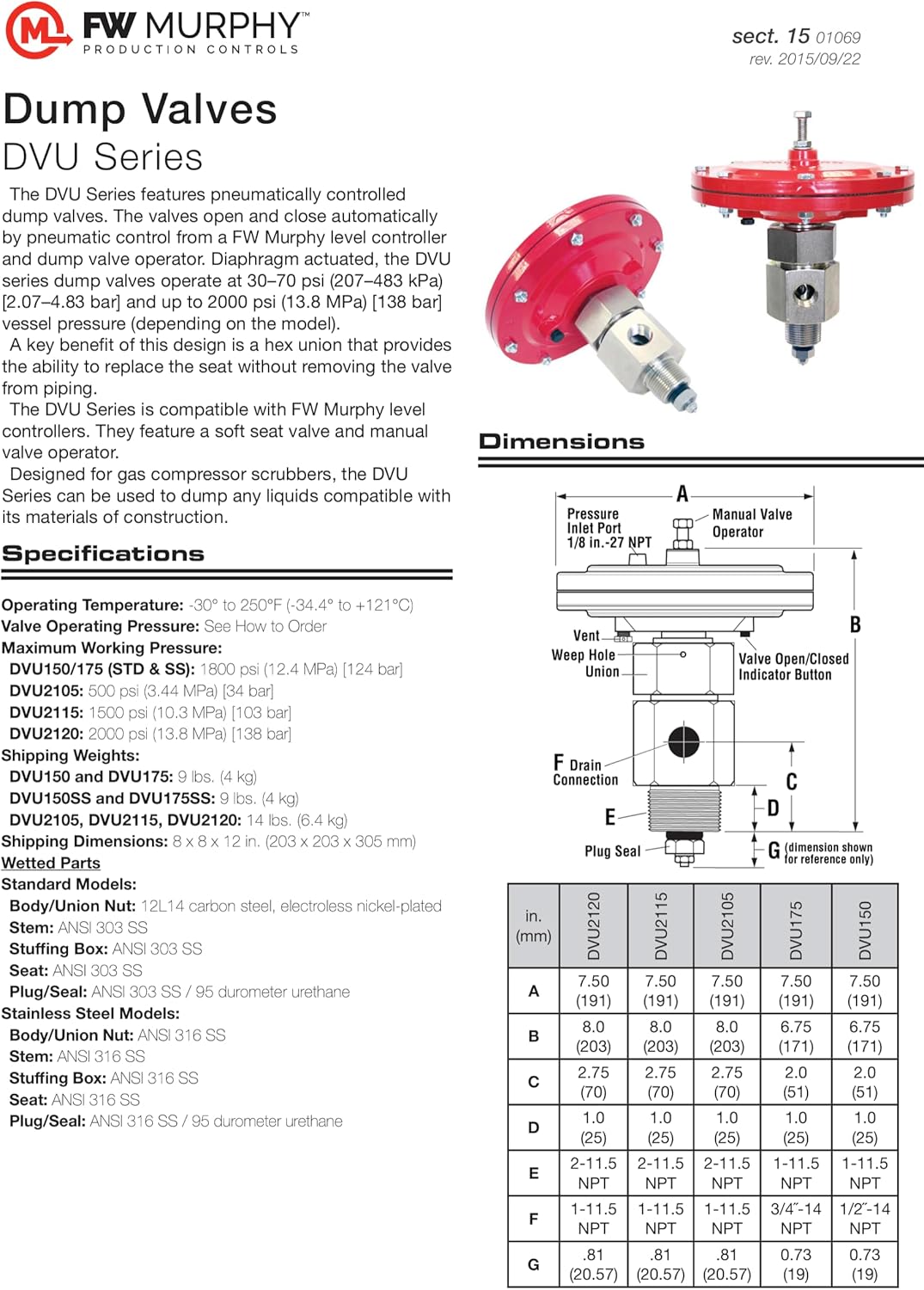 The DVU Series is compatible with FW Murphy level controllers. They feature a soft seat valve and manual valve operator. Designed for gas compressor scrubbers, the DVU Series can be used to dump any liquids compatible with its materials of construction