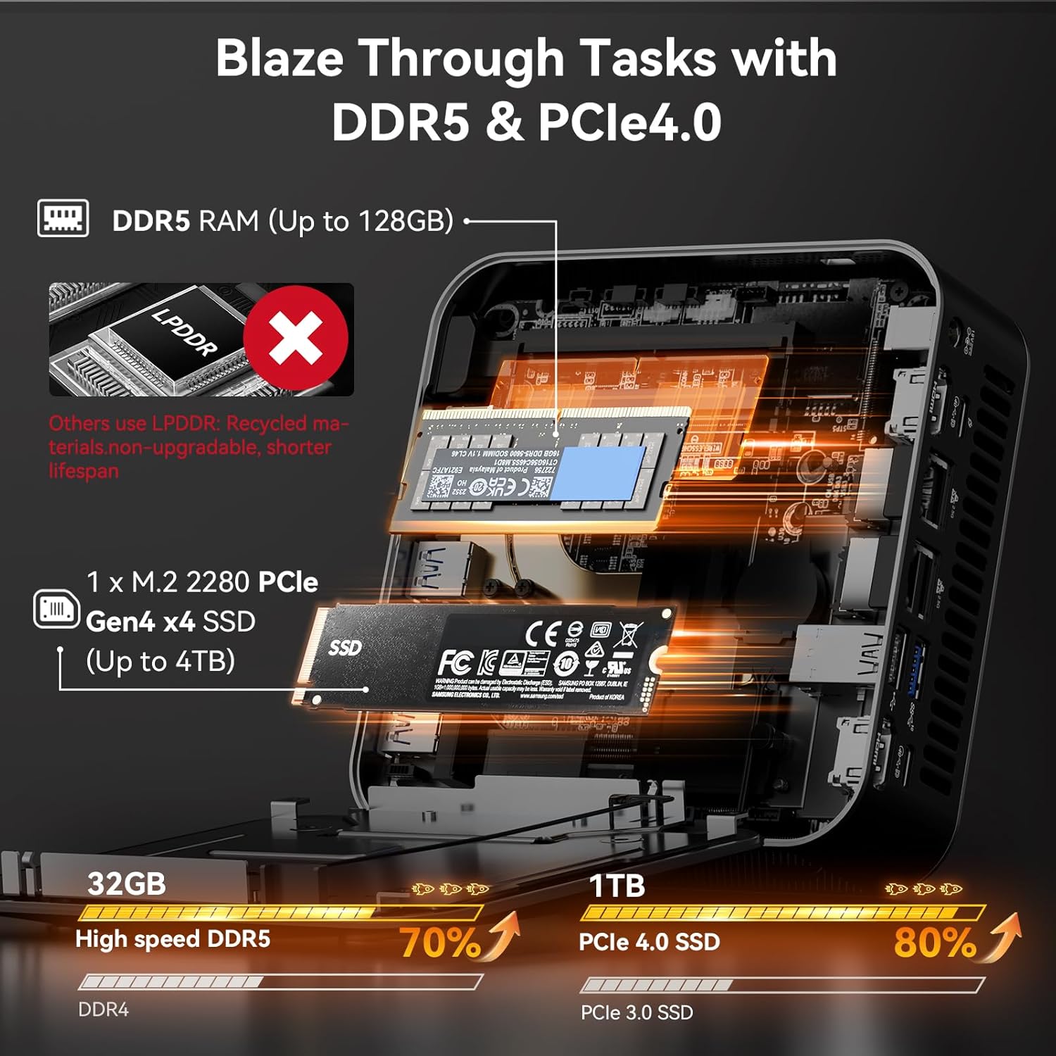 ➍[𝗘𝘅𝗽𝗮𝗻𝗱𝗮𝗯𝗹𝗲 𝘁𝗼 𝟭𝟮𝟴𝗚𝗕 𝗥𝗔𝗠, 𝗨𝗽𝗴𝗿𝗮𝗱𝗮𝗯𝗹𝗲 𝘁𝗼 𝟴𝗧𝗕 𝗦𝗦𝗗] 𝗠𝗼𝘃𝗲 𝗯𝗲𝘆𝗼𝗻𝗱 𝘁𝗵𝗲 𝗳𝗶𝘅𝗲𝗱 𝗹𝗶𝗺𝗶𝘁𝘀 𝗼𝗳 𝘀𝗼𝗹𝗱𝗲𝗿𝗲𝗱 𝗟𝗣𝗗𝗗𝗥 𝗺𝗲𝗺𝗼𝗿𝘆. Experience power without compromise in the compact GEEKOM AX8 Max business mini desktop computer. It arrives ready to perform with Windows 11 Pro, 32GB of DDR5 RAM (expandable to 128GB), and a 1TB PCIe Gen4 NVMe SSD (upgradable to 8TB). Stay connected at top speed with Wi-Fi 6E across 2.4GHz, 5GHz, and 6GHz bands, while Bluetooth 5.3 delivers extended range and rock-solid stability for smooth, near-zero-latency pairing across all your devices
