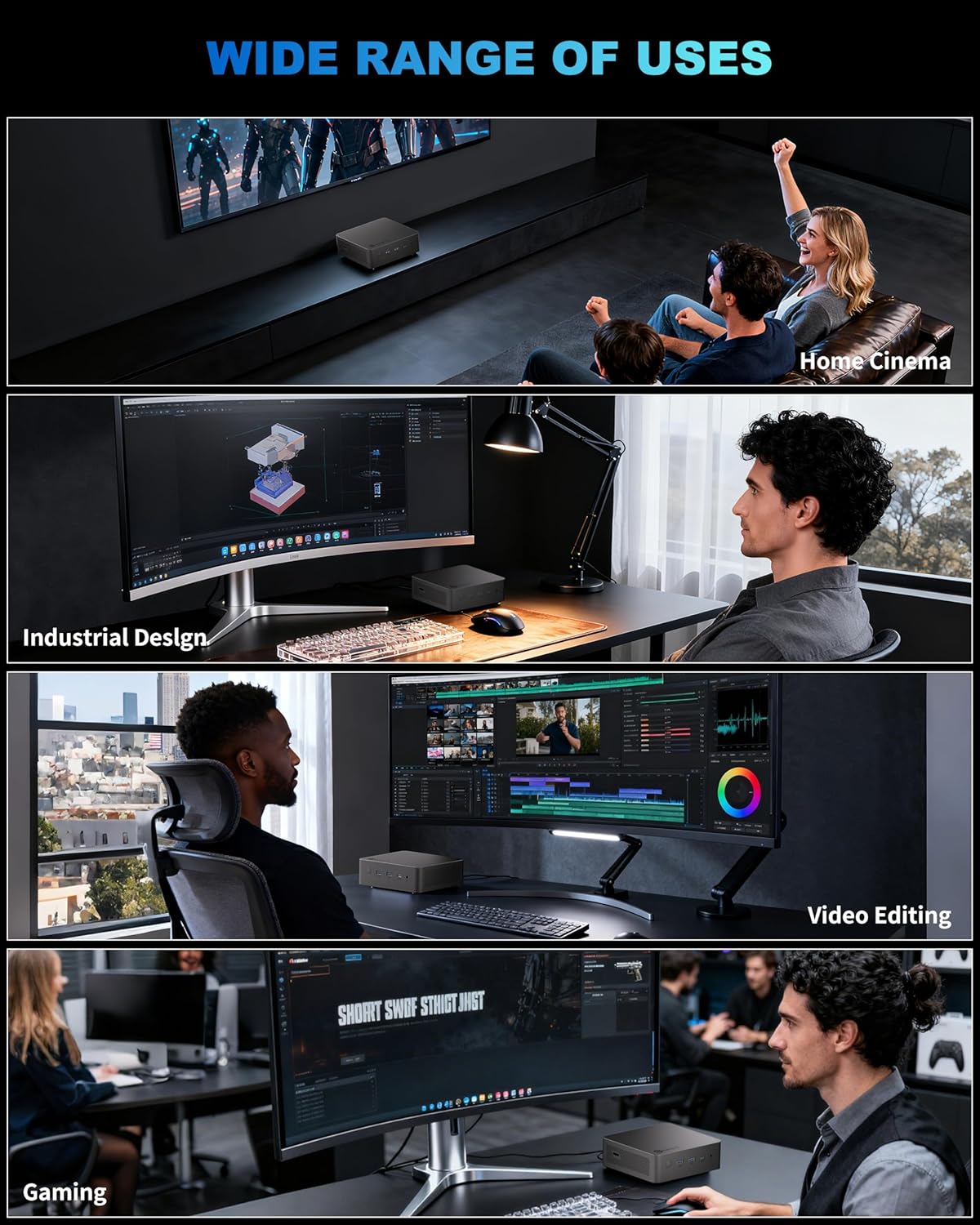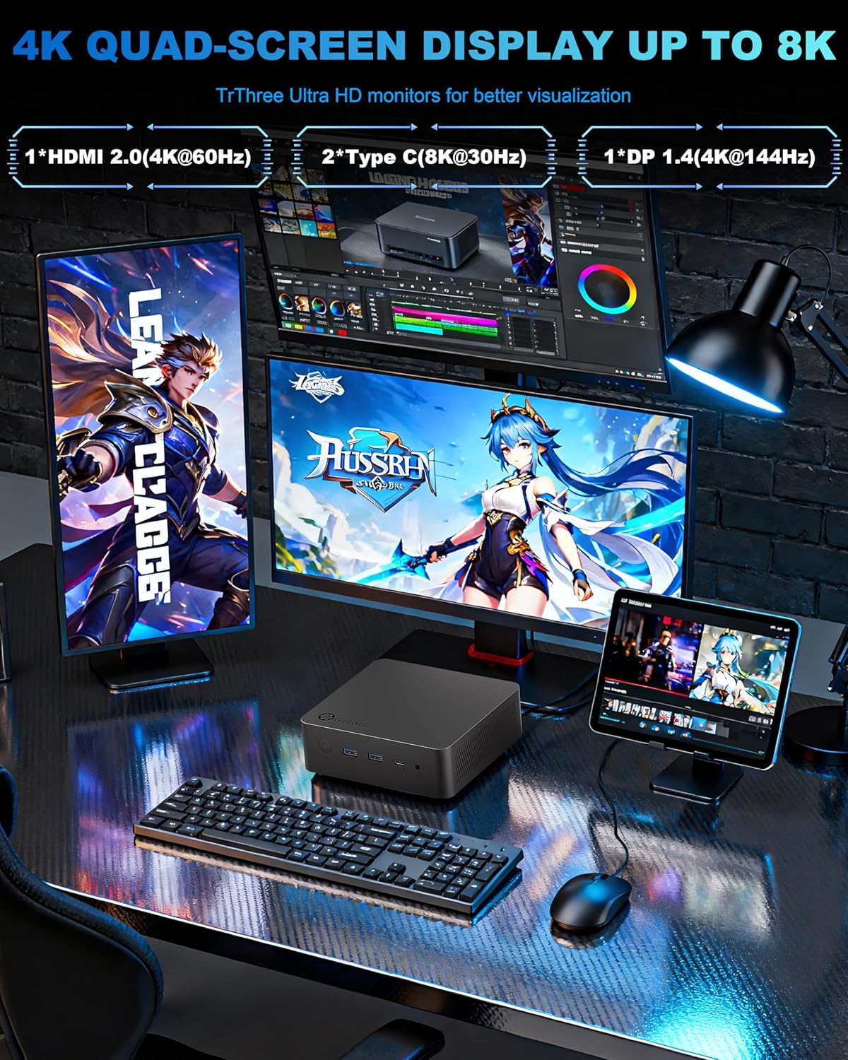【Unleash Your Creativity on Four Screens】Expand your visual real estate and productivity. With support for up to four independent displays (4K@120Hz) via dual Type-C 4, HDMI, and DisplayPort, this micro computer is well-suited for financial traders, content creators, and multitaskers who need a seamless, immersive workflow or a stunning mini pc home theater experience.