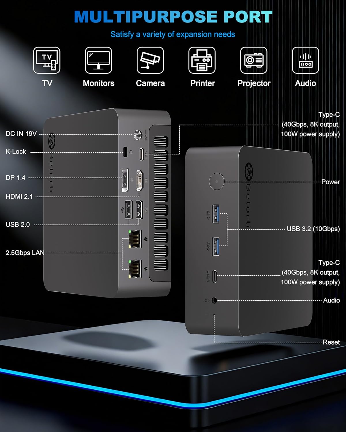【Ultra-Connectivity with Next-Gen Ports】Equipped with a comprehensive set of ports, including two 2.5G Ethernet ports for lag-free online gaming and fast file transfers, two USB-C 4.0 (supporting 40Gbps data, display output, and charging), two USB 3.2 ports, HDMI, DP, and a 3.5mm audio jack. Coupled with Wi-Fi 6 and Bluetooth 5.2, this micro pc offers ultimate convenience for all your peripherals and stable wired/wireless connections, all designed to keep your workspace clean and highly efficient.