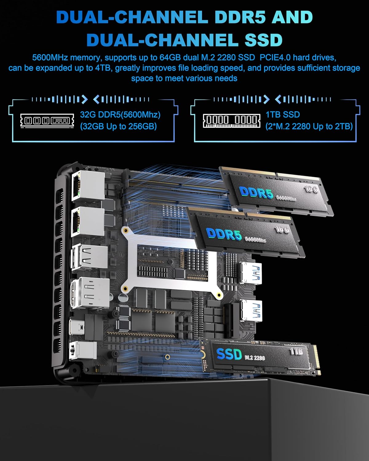 【High-Speed Memory & Massive Storage】Get started immediately with a massive 32GB of dual-channel DDR5 RAM (5600MHz), expandable up to 256GB, paired with a lightning-fast 1TB PCIe 4.0 NVMe SSD, upgradable to 4TB. This mini pc Ryzen 7 ensures rapid application loading, smooth multitasking, and provides abundant storage for all your projects and files, making it one of the most capable mini computers for power users.