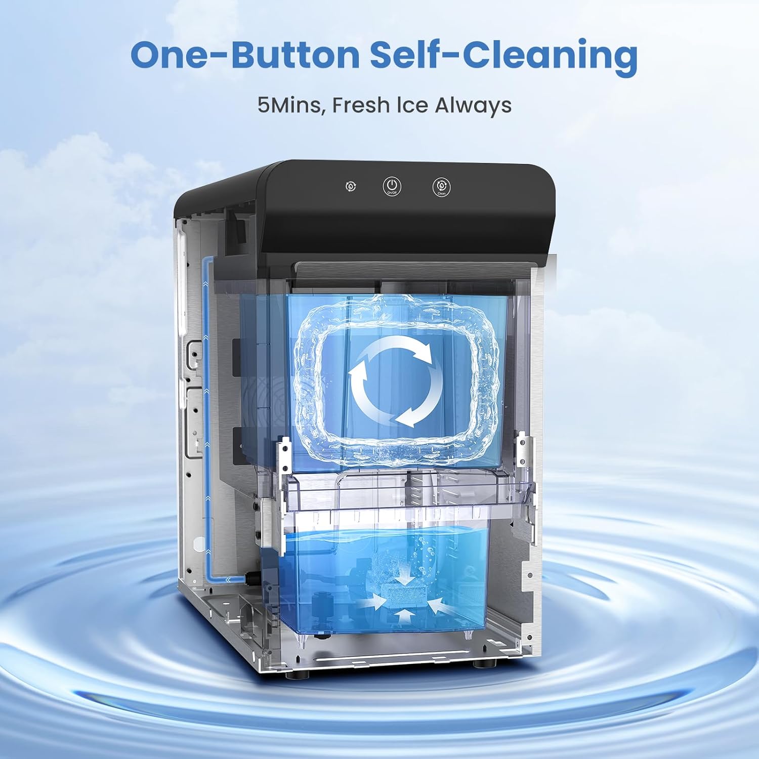 𝐒𝐦𝐚𝐫𝐭 𝐀𝐮𝐭𝐨&𝐒𝐞𝐥𝐟 𝐂𝐥𝐞𝐚𝐧𝐢𝐧𝐠-This nugget ice machine features an ice full infrared sensor that stop producing ice when the ice basket is full. The indicator light will turn on. The built-in descaling system automatically cleans internally, delivering fresh-tasting ice every time while preventing mineral buildup for long-lasting performance.