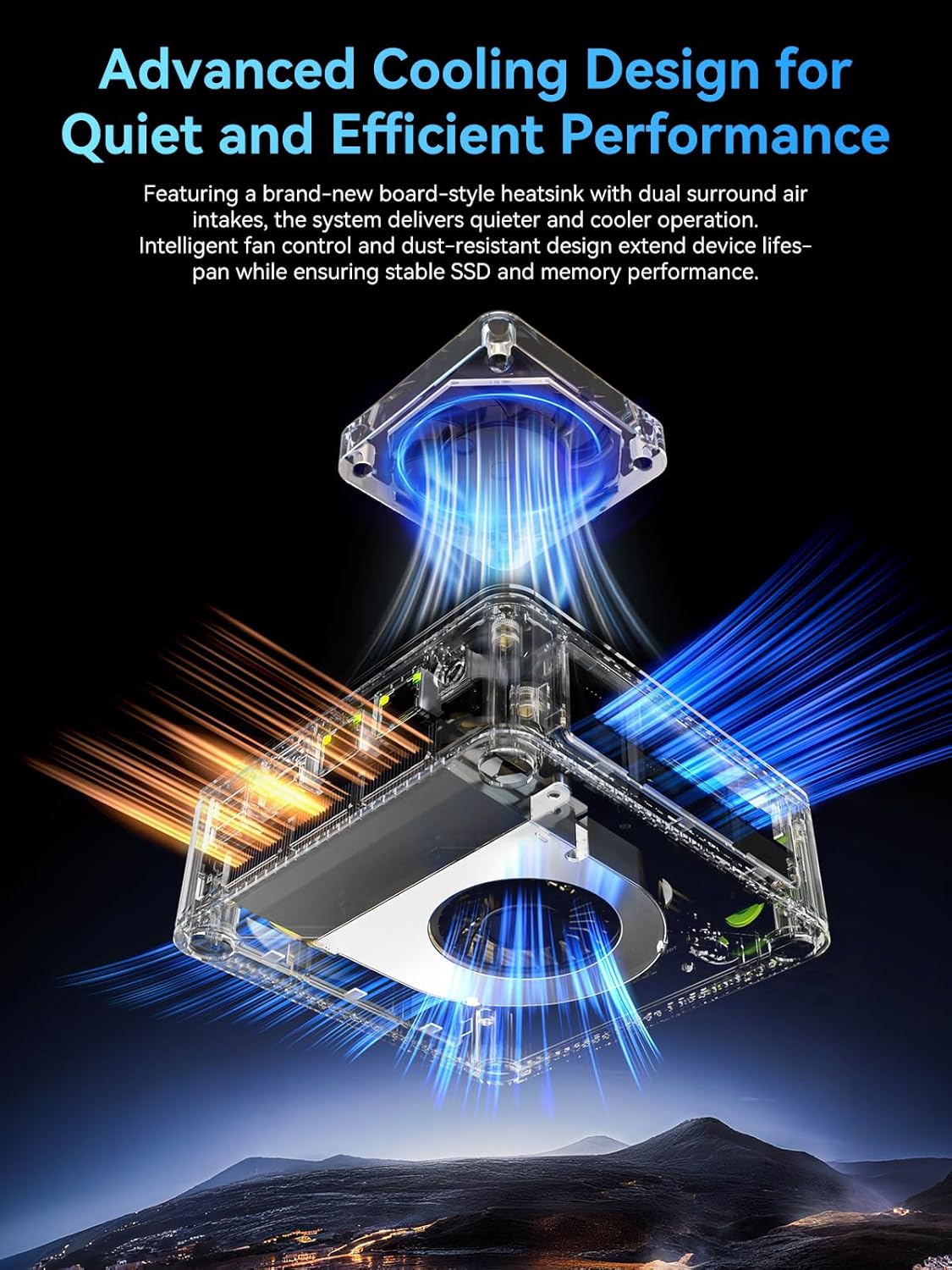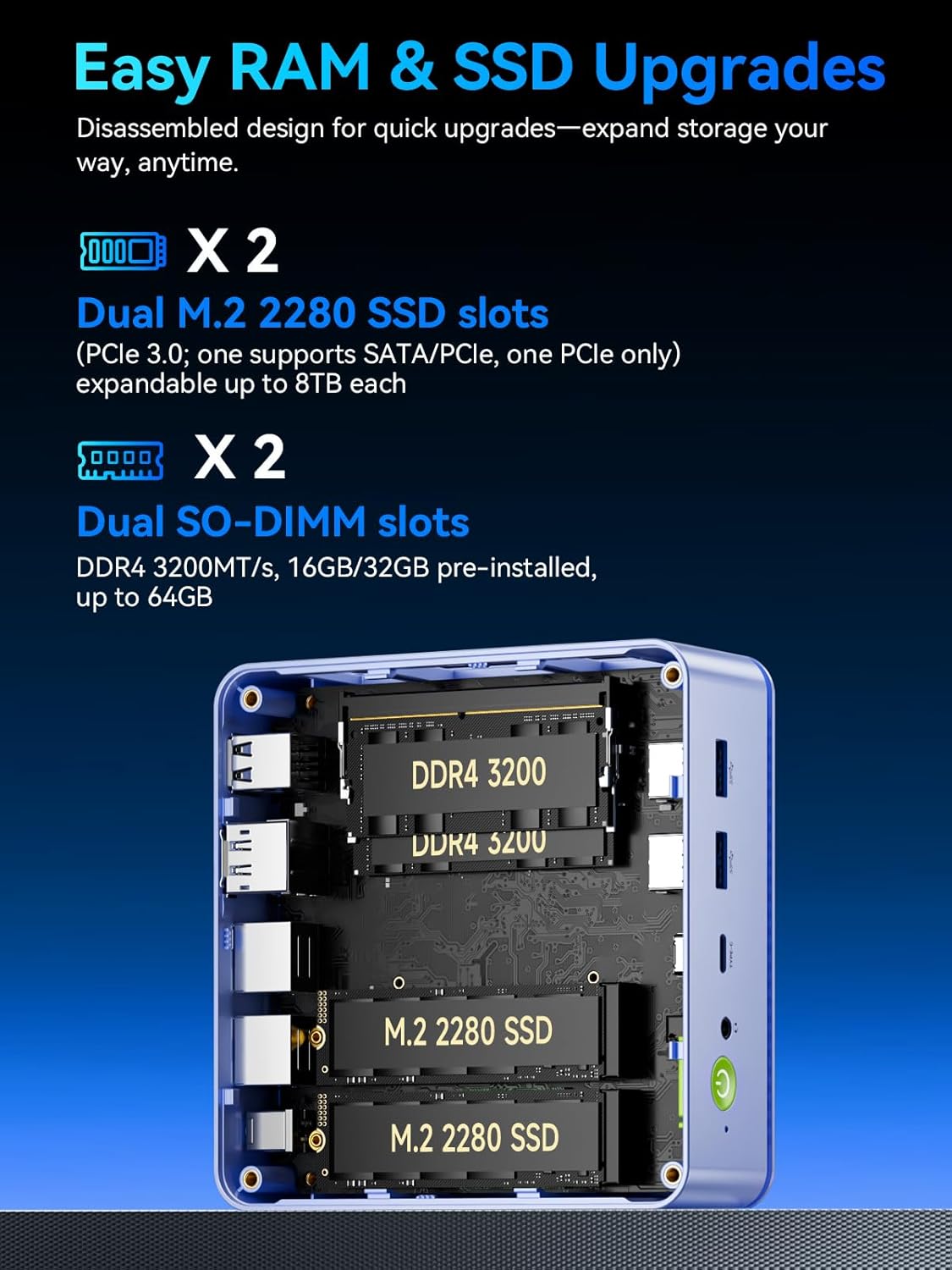 32GB DDR4 RAM & 1TB PCIe SSD – Installed with DDR4 32GB RAM Dual Channel (2x16GB), the Nucbox M5 Plus mini pc support expansion to 64GB RAM. Featured with 1TB M.2 2280 PCIe 3.0 SSD, support dual slot expansion to 4TB SSD. (Upgrades not included)