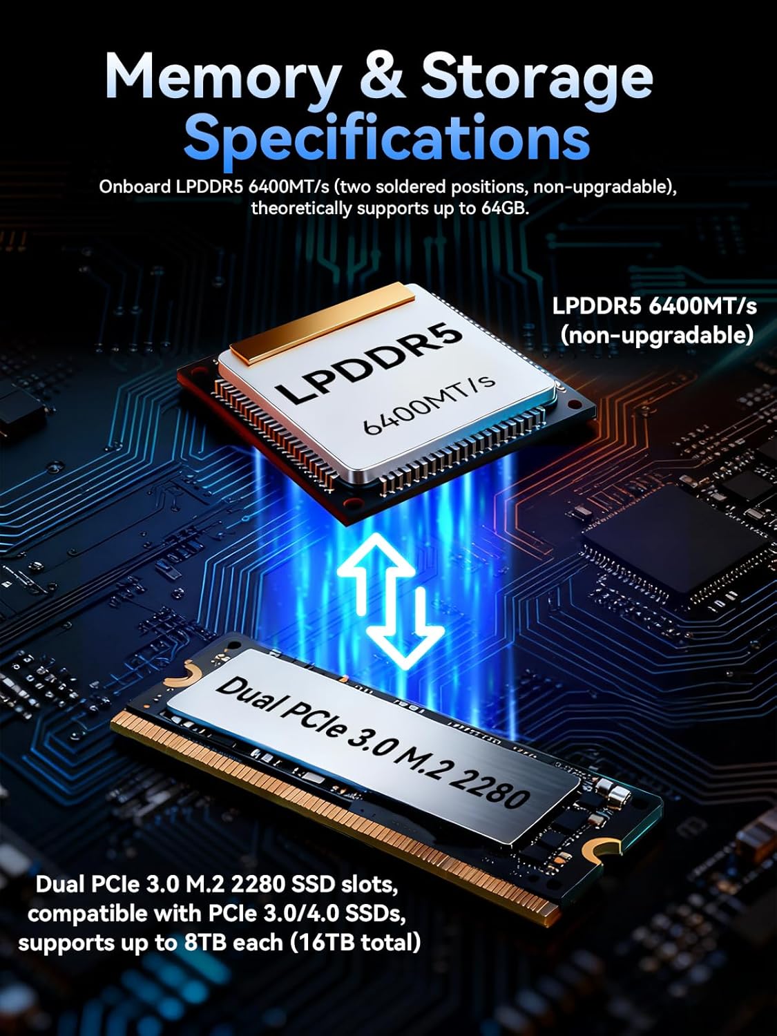 Ultra-Fast LPDDR5 Memory & Massive Storage Expansion – Features 16GB LPDDR5 6400 MT/s high-speed memory and a 512GB NVMe SSD. Dual M.2 2280 slots support up to 8TB total storage, giving you massive space for games, projects, and media.