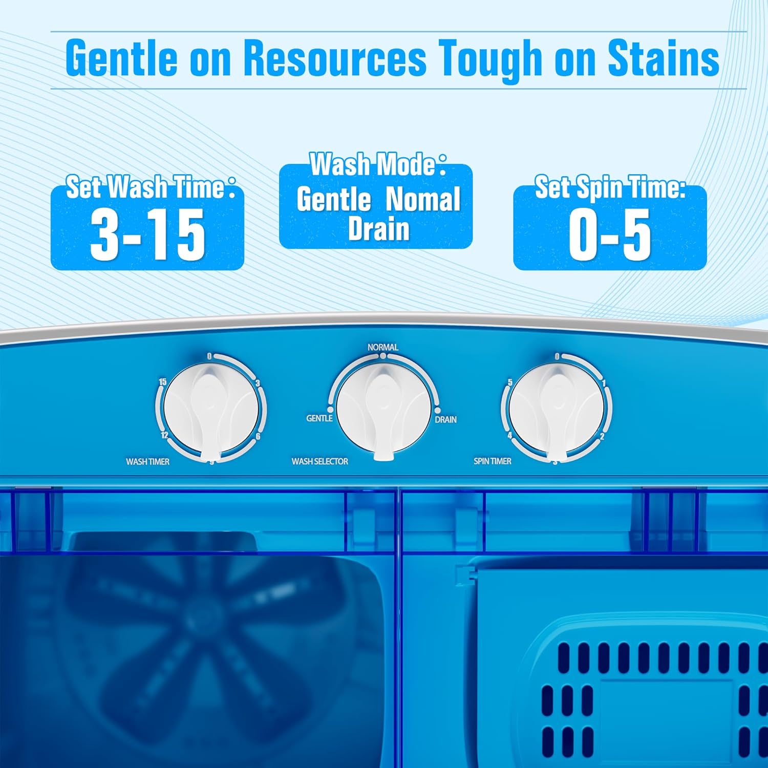 【Separate Time Control】:The apartment washing machine controls washing cycle is up to 15 minutes and the spinning cycle is up to 5 minutes each load, finish fast washing and saving you valuable time and. Washing modes: Gentle/Norma/Drain, which is free to set your timer and mode