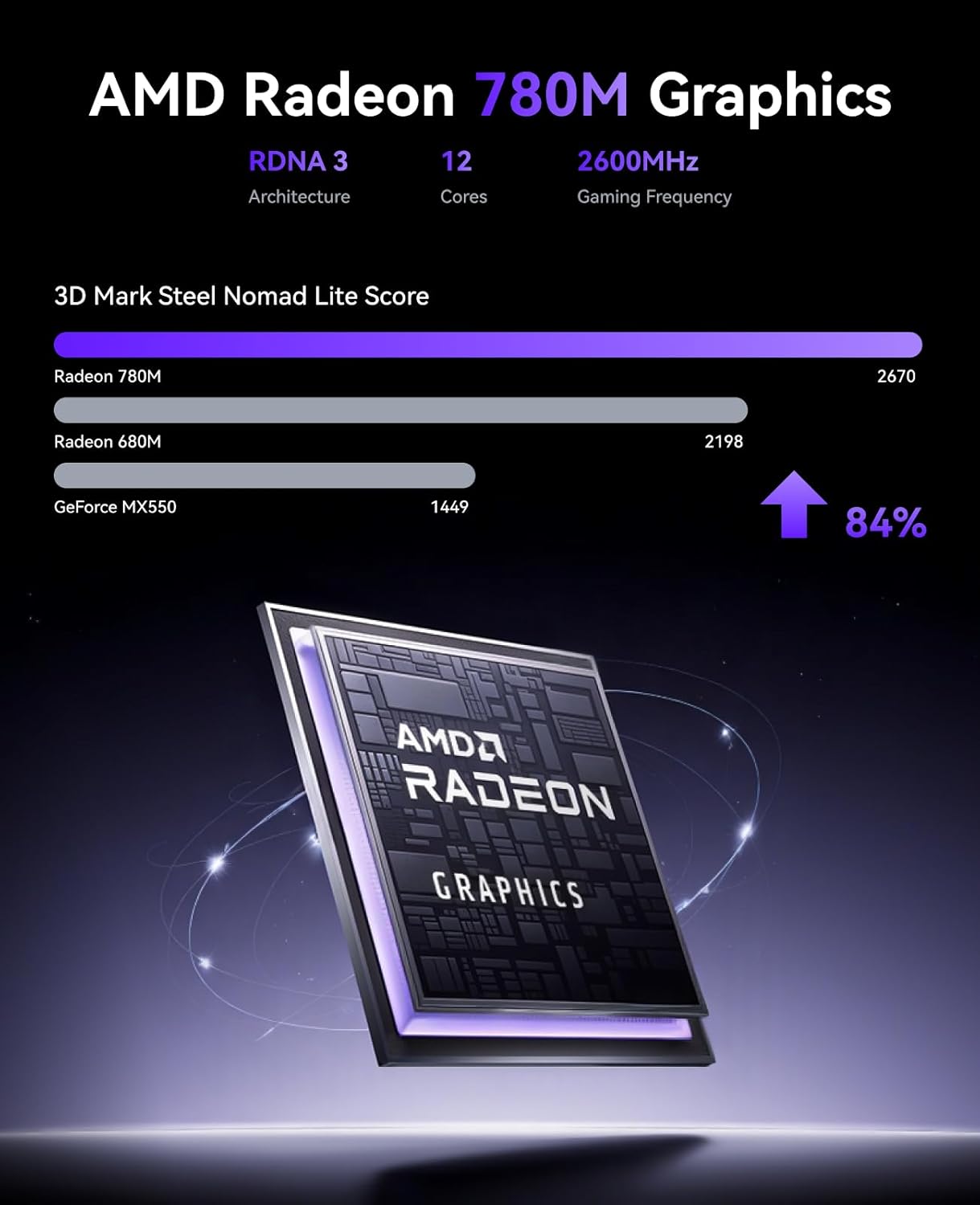 Powerful Integrated Graphics Card – AMD Radeon 780M: The AM21 Mini Desktop PC features the AMD Radeon 780M, harnessing the power of the RDNA 3 architecture. It delivers a smooth 1080p gaming experience, offering twice the performance of Iris Xe graphics and rivaling dedicated graphics cards like the 1650. Supports AV1 codec for smoother, higher-quality 8K display. With this unmatched graphics capability, the KAMRUI AM21 Mini Gaming PC redefines the possibilities of mini gaming computers, delivering an ultimate visual experience