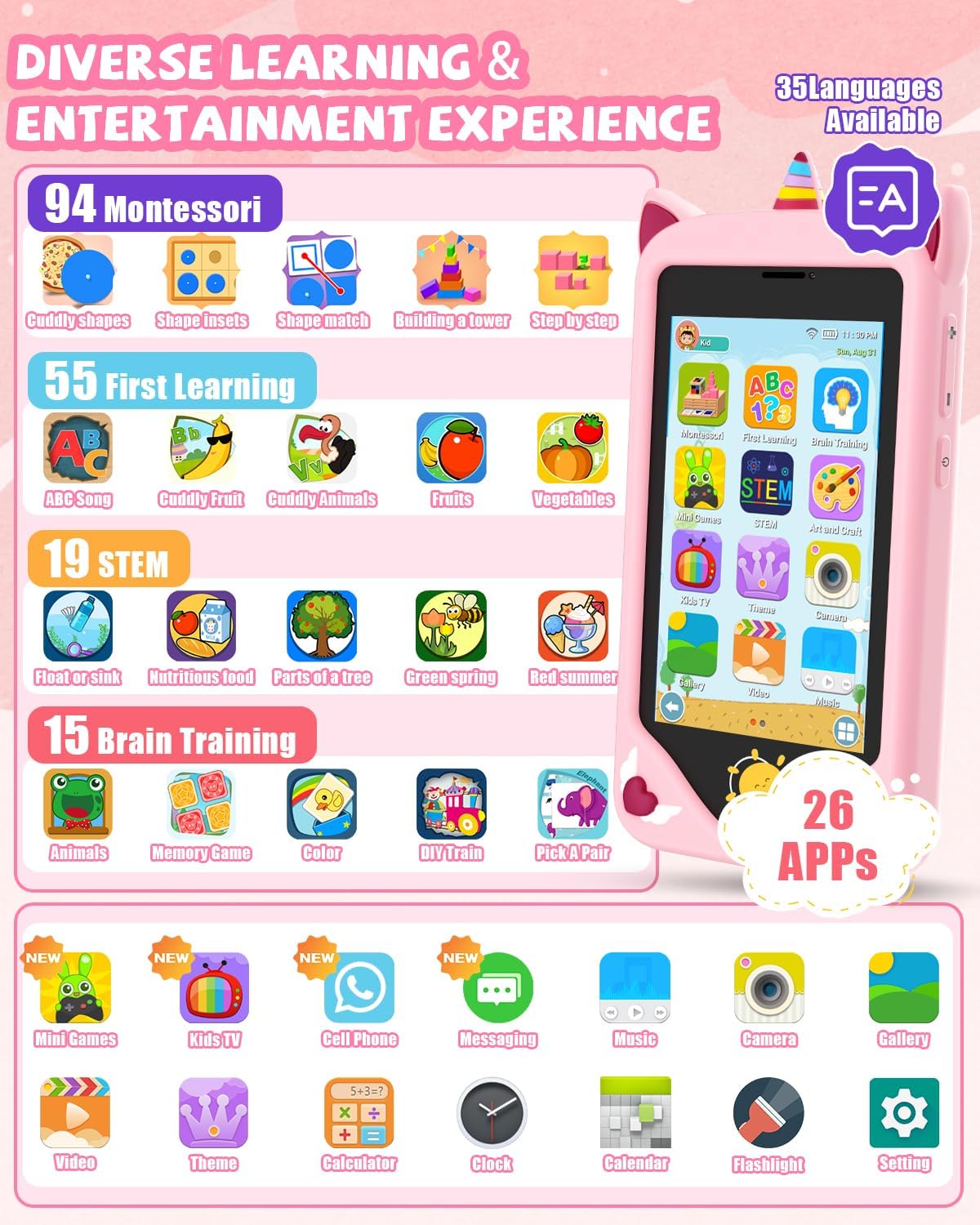 Educational & Entertaining Toddler Phone: Designed for both learning and play, this toddler phone includes educational games, STEM apps, music, stories, and creative tools to foster imagination and problem-solving. It turns screen time into a healthy balance of education and entertainment for children of all ages.