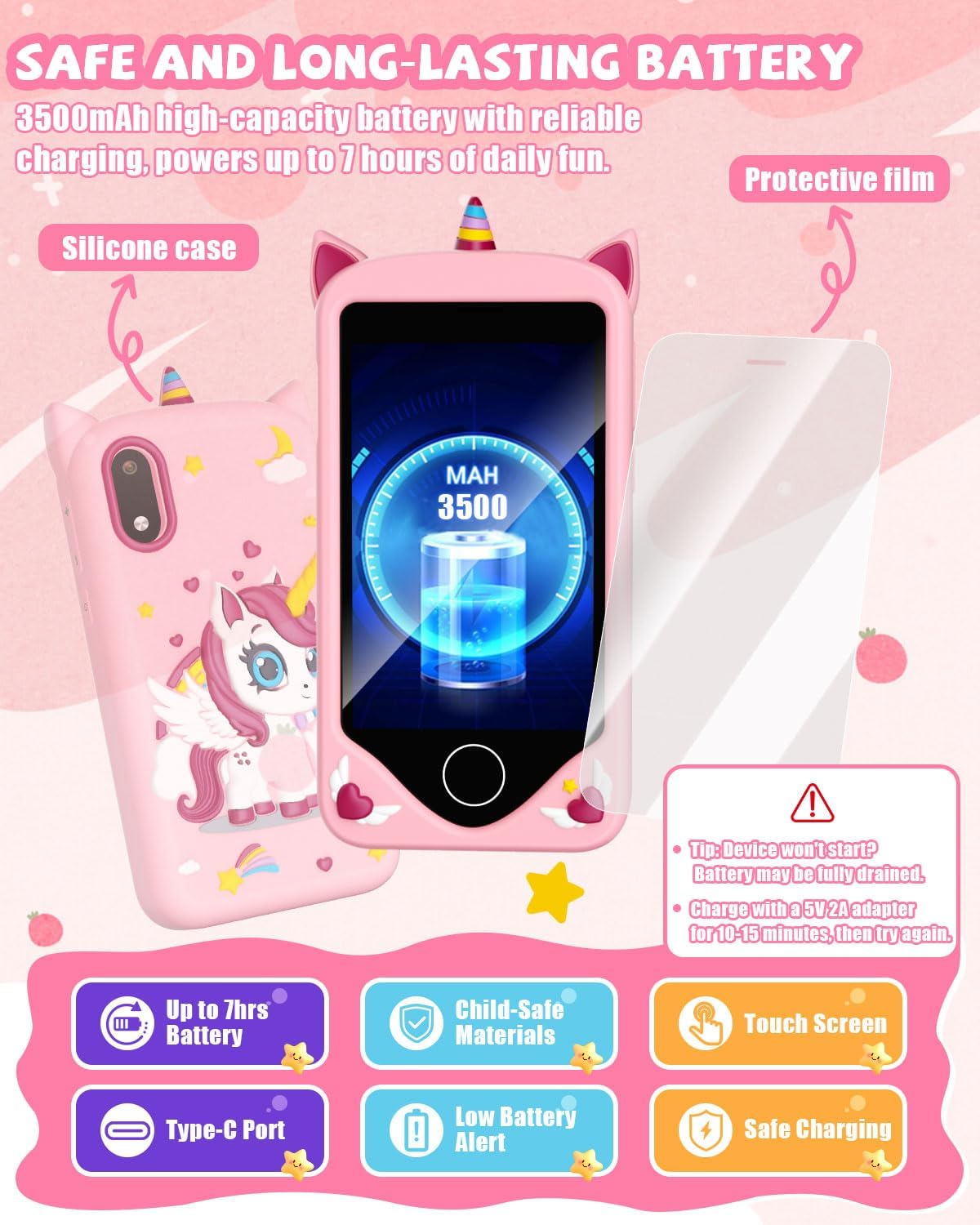 Ample Storage & Long Battery Life: With 16GB built-in storage and a bonus 32GB SD card, this kids cell phone provides plenty of room for videos, photos, and learning content. The 3500mAh rechargeable battery offers extended use for schoolwork, entertainment, and family calls without frequent charging.
