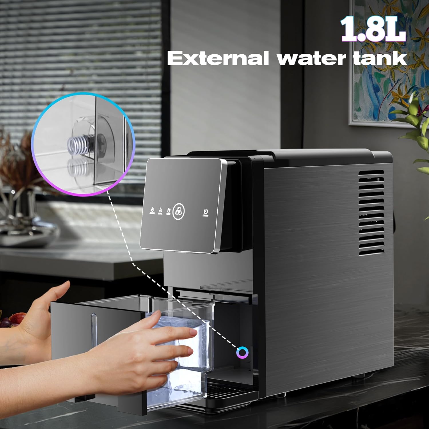 【Removable Tank, Convenient Design】 The removable water tank ice maker with a 1.8L water reservoir allows fast refills and effortless cleaning. Smooth surfaces make it hygienic and simple to maintain, giving you an easy to clean intelligent ice maker for everyday use.