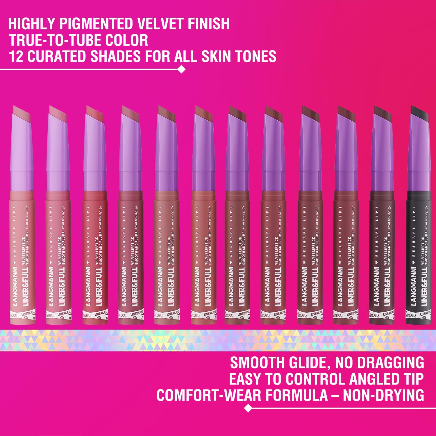 The fine-point edge acts like a lip liner for sharp outlining, while the wider angled side functions as a full-coverage lipstick for effortless filling. One pencil replaces two separate products.