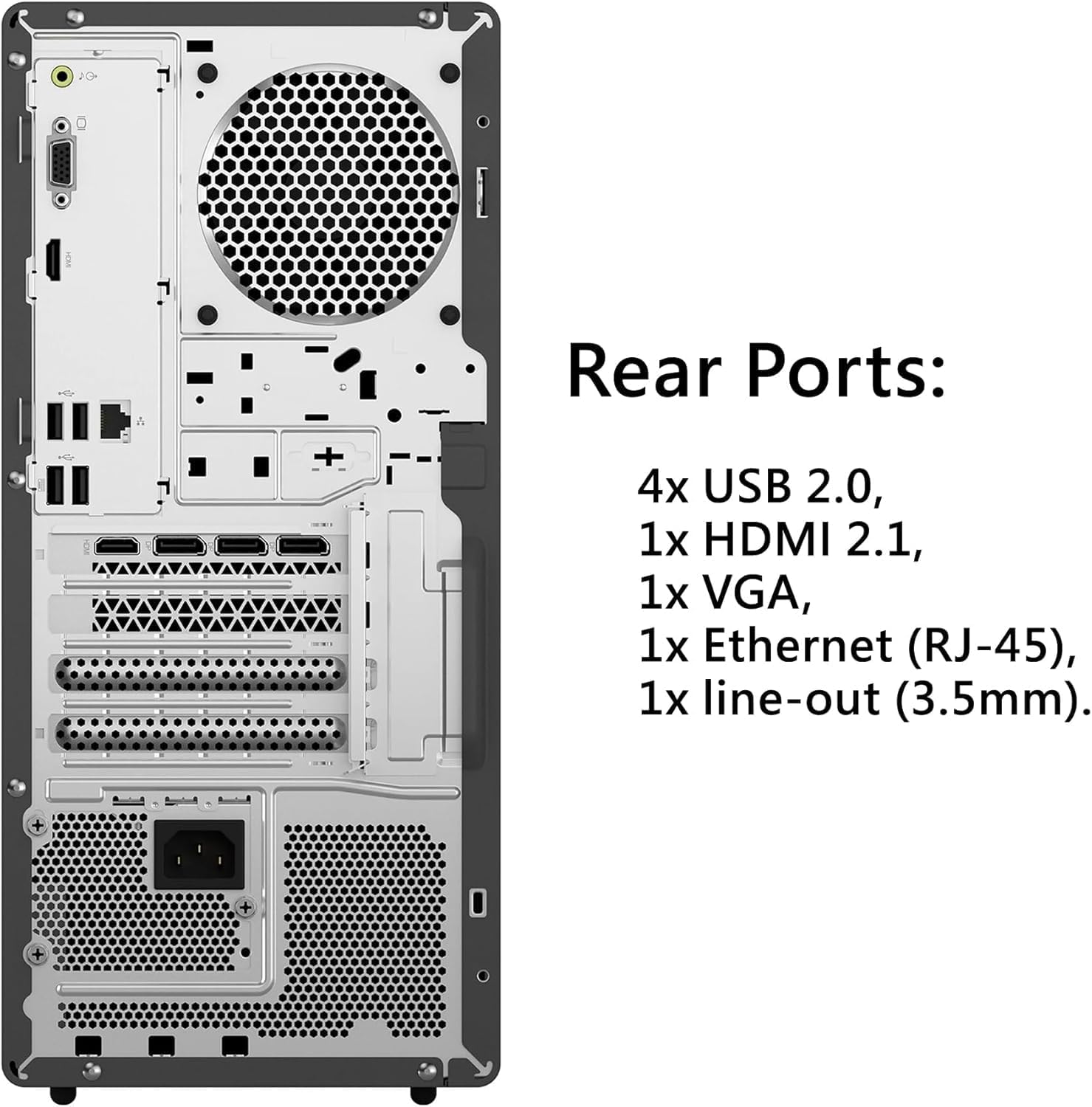 Versatile Ports for Any Setup – Front USB-C and USB-A 3.2 ports, multiple rear USB-A, HDMI 2.1, VGA, and audio jacks support monitors, external drives, and accessories, making this tower ideal for home, office, and school use.