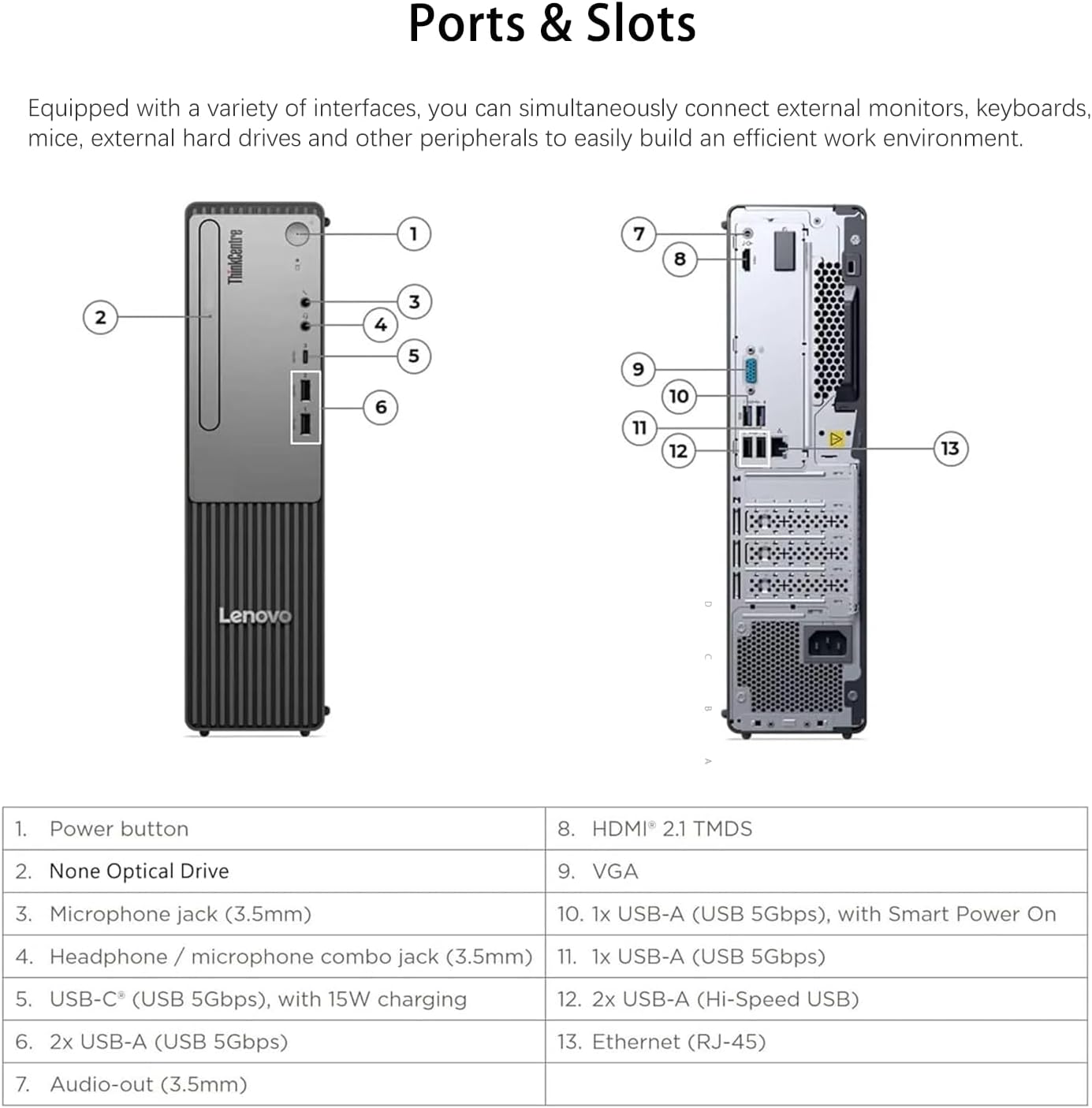 [Quad Display Support] Front: 1x USB-C (USB 5Gbps), with 15W charging, 2x USB-A (USB 5Gbps), 1x headphone / microphone combo jack, 1x microphone, Rear Ports: 2x USB-A (Hi-Speed USB / USB 2.0), 2x USB-A (USB 5Gbps / USB 3.2 Gen 1), 1x HDMI, 1x VGA, 1x Ethernet (RJ-45), 1x line-out (3.5mm), Windows 11 Pro, perfect for professionals who need expanded screen space for trading dashboards, development environments, or creative tasks.