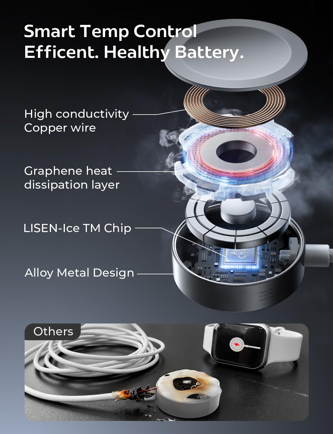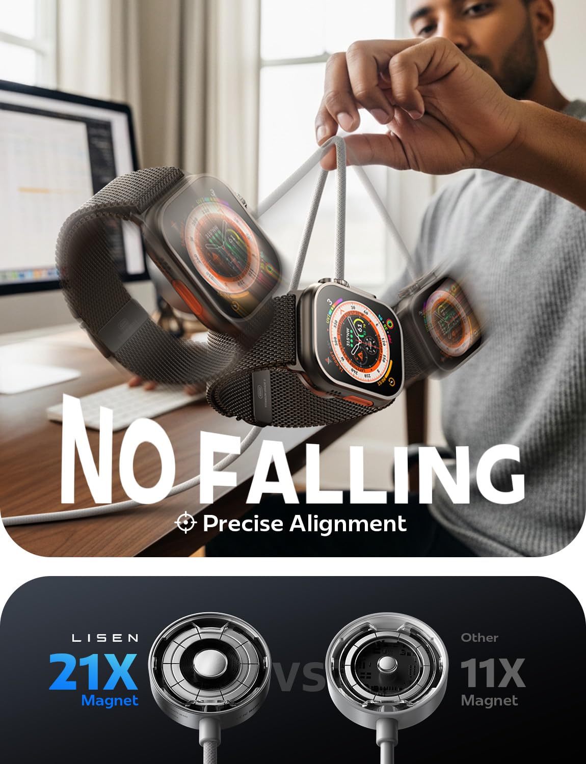 ADVANCED SAFETY & COOLING: LISEN iwatch charger fast charging applewatch for series 11 / Ultra 3 features aluminum alloy housing with temperature control chips and graphene semiconductor layers for cooler operation. Certified by RoHS, CE, and FCC with comprehensive protection against over-current, over-voltage, over-temperature, and short-circuit situations for ultimate safety.