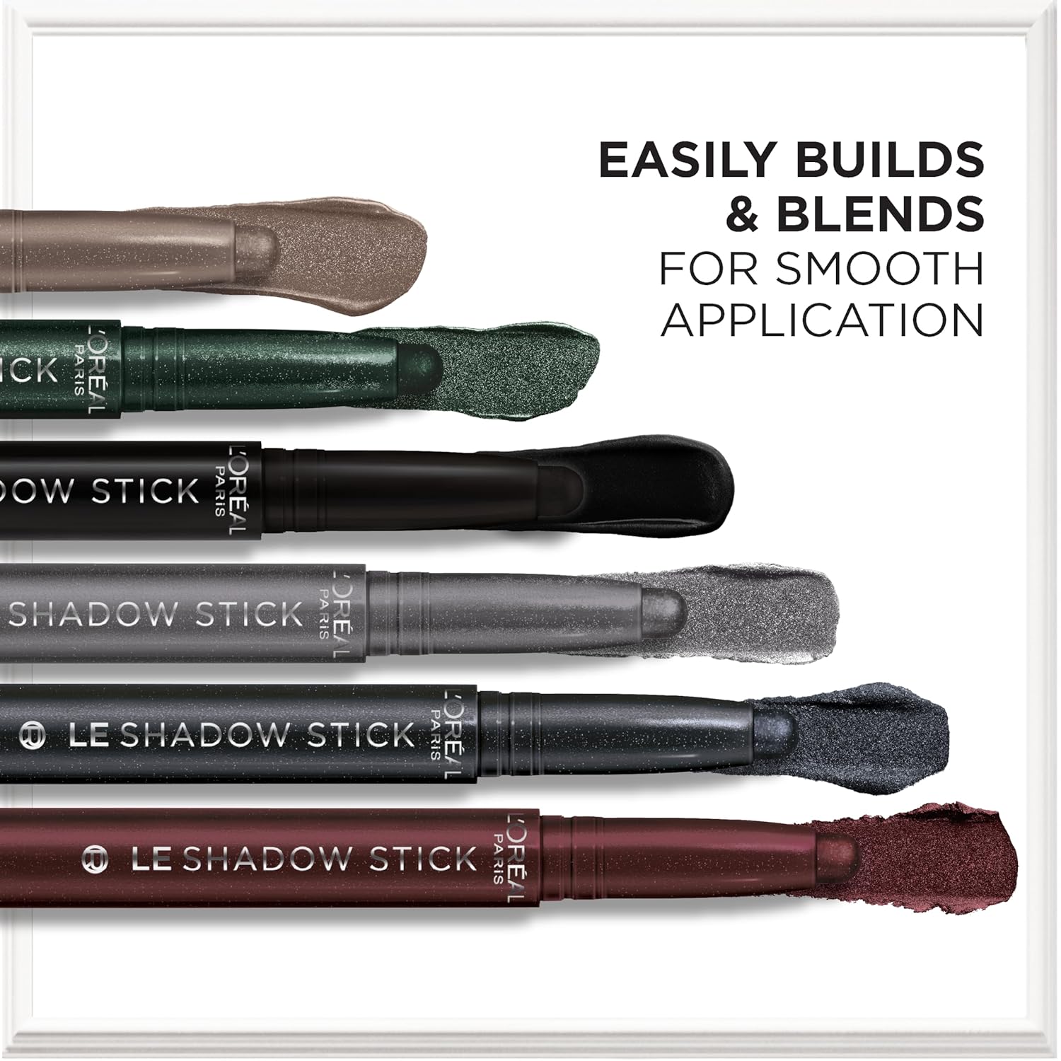 Bold, creamy color that glides on effortlessly & evenly. Easily build and blend the perfect Smokey Eye with our new L’Oreal Paris Le Shadow Stick Smokeys. Even and smooth application with 6 smokey shades. Bold, rich color on a variety of skin tones. Crease-proof, transfer & smudge resistant. Available in matte, metallic, + shimmer shades.