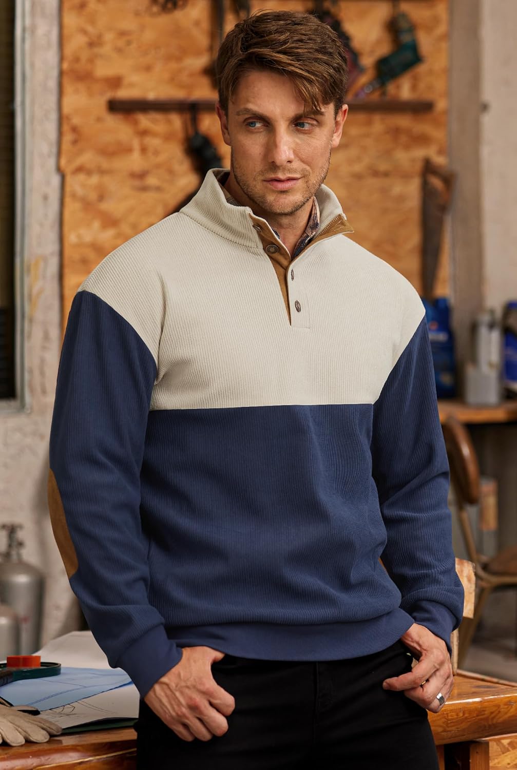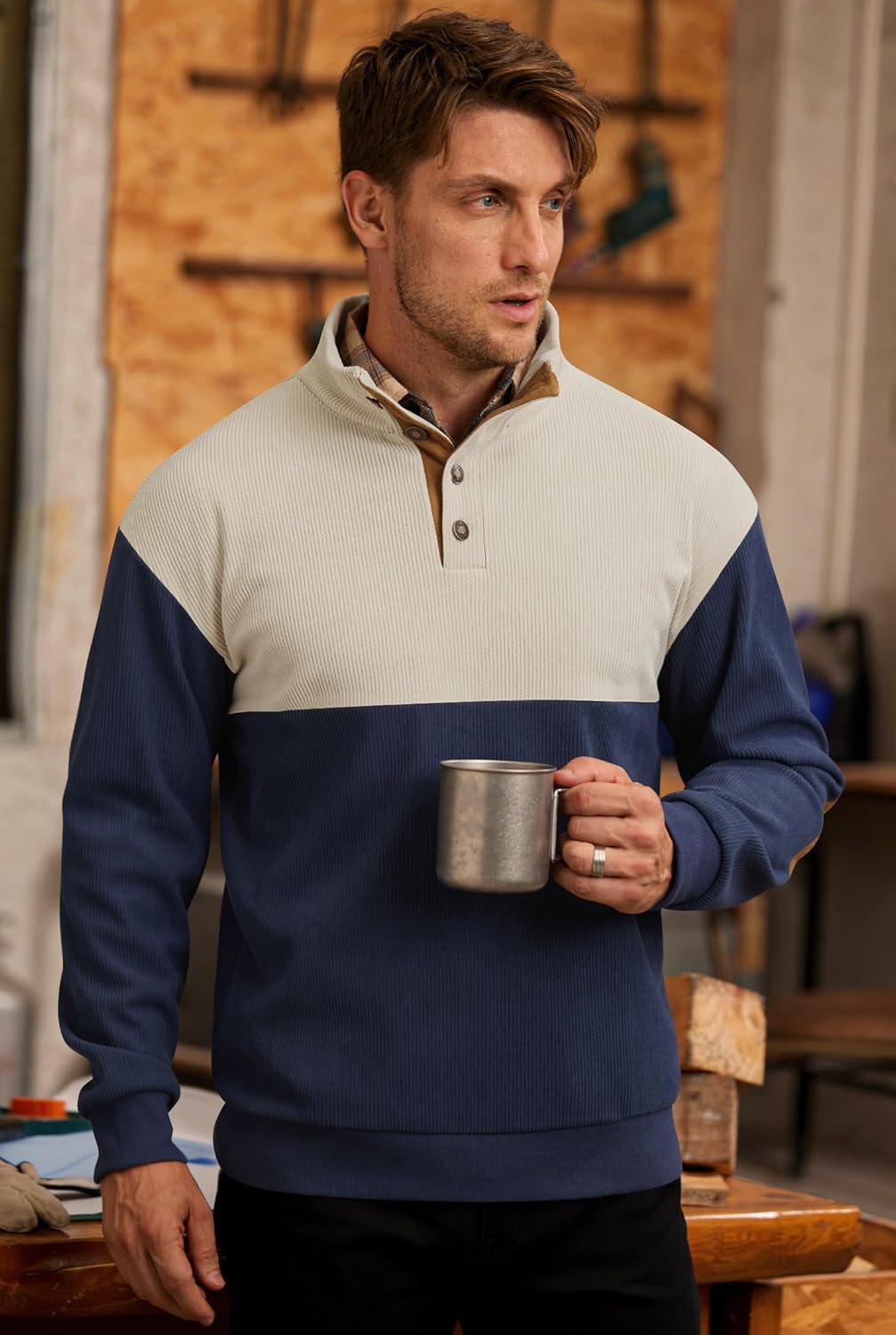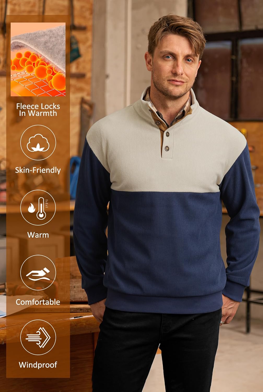 Mens Corduroy Fleece-Lined Sweatshirts Winter Heavyweight Casual Fashion Button Pullover (S-3XL)